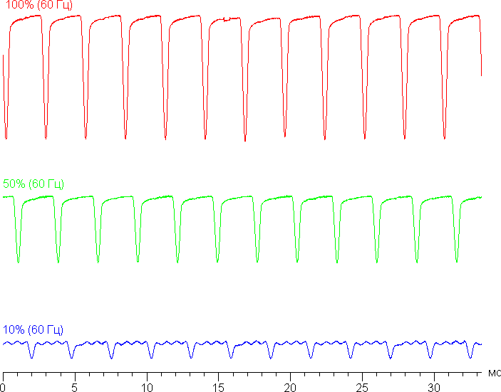 На любом уровне яркости присутствует значимая модуляция с частотой 360 Гц. На рисунках ниже приведены зависимости яркости (вертикальная ось) от времени (горизонтальная ось) для нескольких значений настройки яркости: