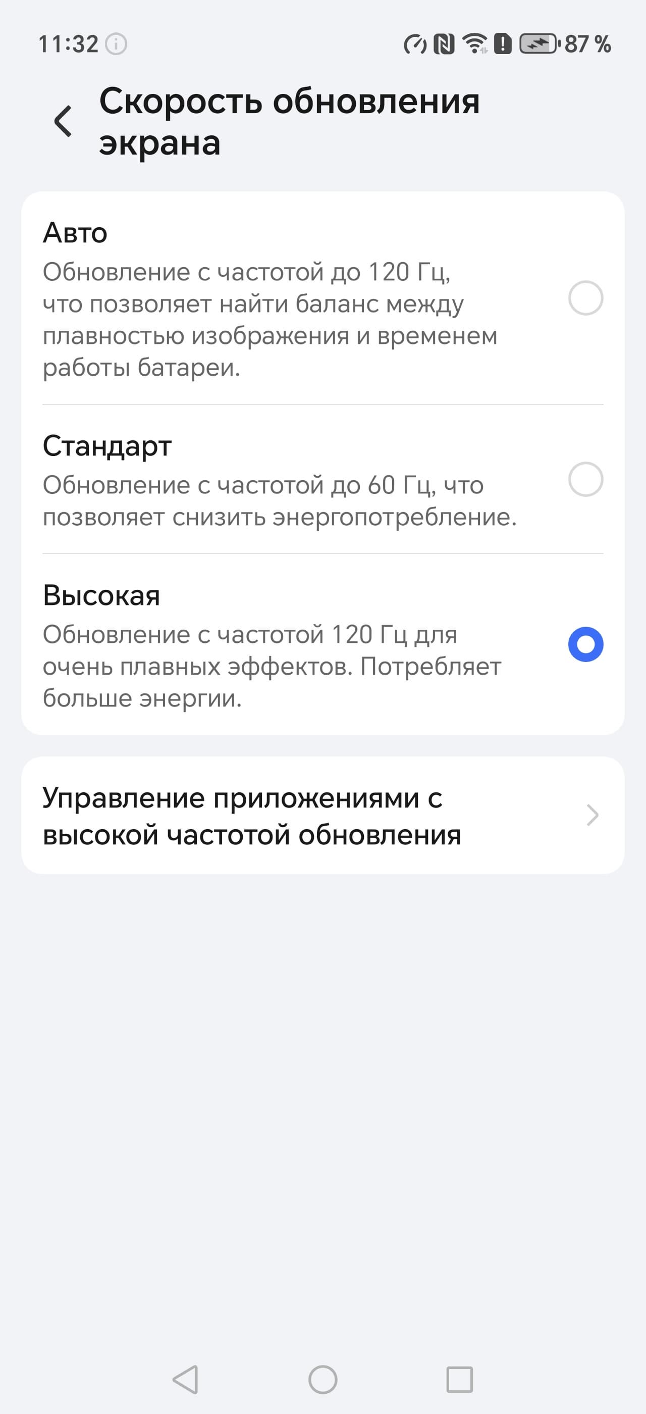 В настройках экрана можно включить режим с повышенной до 120 Гц частотой обновления.