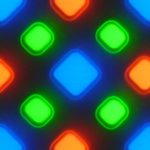 На фрагменте выше можно насчитать 4 зеленых субпикселя, 2 красных (4 половинки) и 2 синих (1 целый и 4 четвертушки), при этом, повторяя эти фрагменты, можно выложить весь экран без разрывов и перехлеста. Для таких матриц компания Samsung ввела наименование PenTile RGBG. Разрешение экрана производитель считает по зеленым субпикселям, по двум другим оно будет ниже. Разумеется, присутствуют некоторая неровность контрастных границ и другие артефакты. Впрочем, из-за высокого разрешения они лишь минимально сказываются на качестве изображения.
