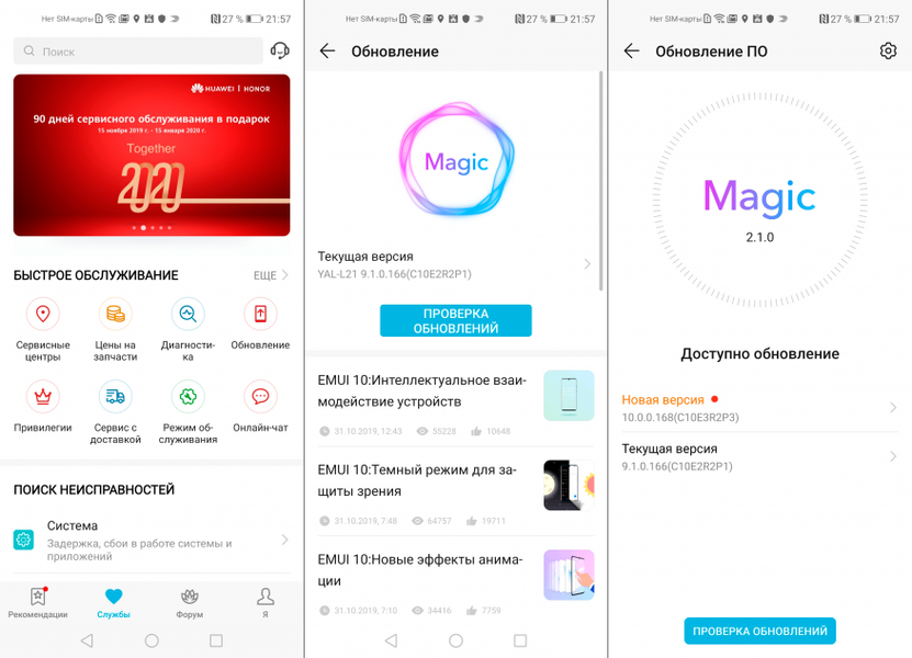 В первую очередь Honor распространяет обновление через пользователей фирменного приложения HiCare. Если системная утилита, доступная через меню «Настройки», показывает, что установленная Magic UI 2.1 — самая свежая из доступных, попытайте счастья в HiCare, нажав «Обновление». В первую очередь компания планирует обеспечить обновлением модели, Honor 10, Honor V10, Honor 8X, Honor 9X, Honor 20s и Honor 20 Lite.