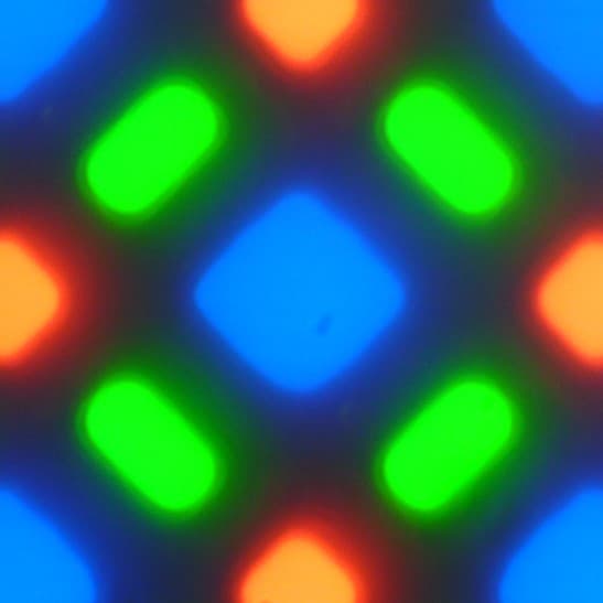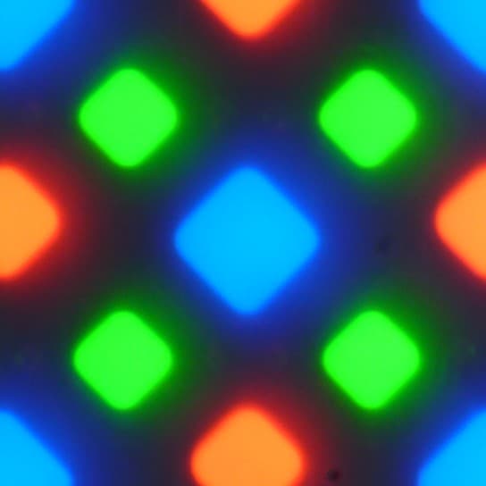 В обоих экранах используется матрица Super AMOLED — активная матрица на органических светодиодах. Полноцветное изображение создается с помощью субпикселей трех цветов — красного (R), зеленого (G) и синего (B), но красных и синих субпикселей в два раза меньше, что можно обозначить как RGBG. Это подтверждается фрагментом микрофотографии: