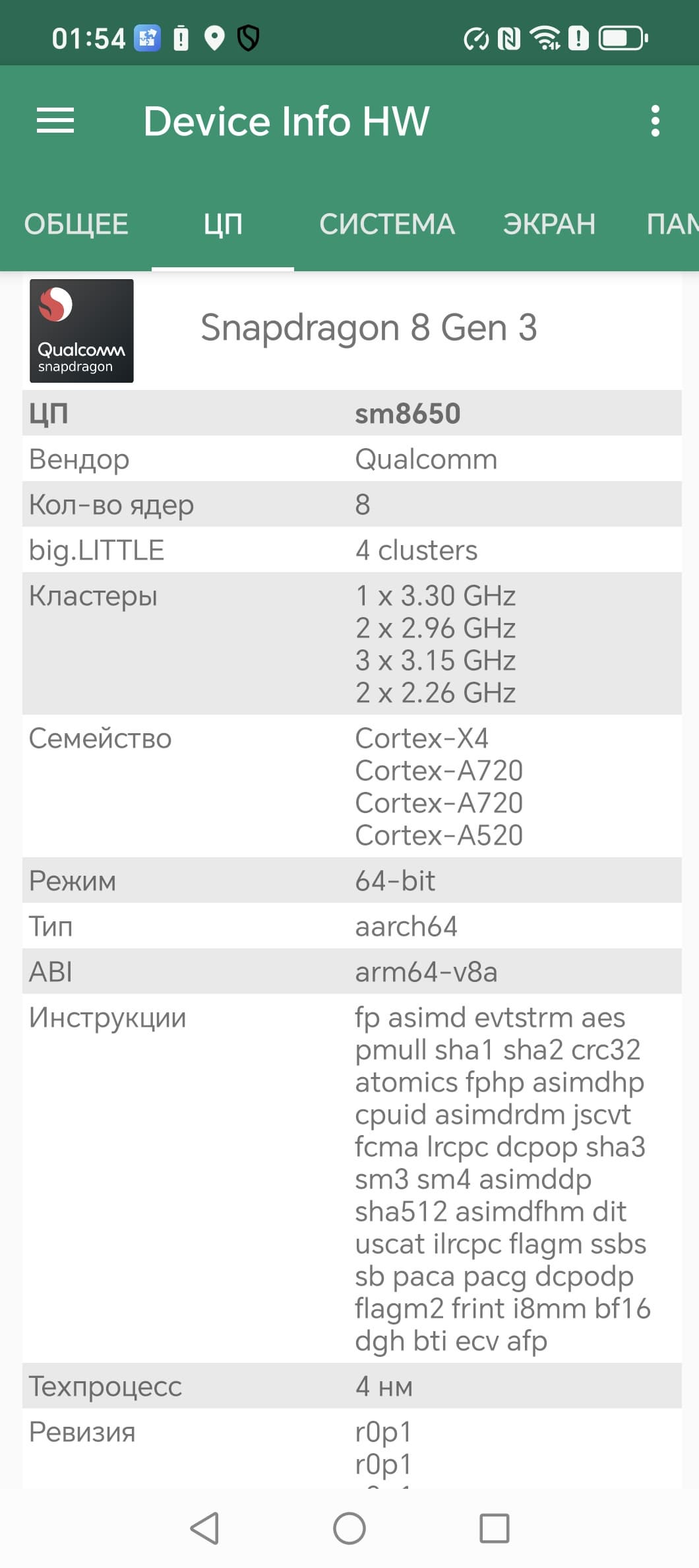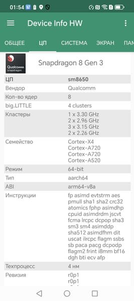 - SoC Qualcomm SM8650-AB Snapdragon 8 Gen3, 8 процессорных ядер (1×Cortex-X4 @3,3 ГГц + 3×Cortex-A720 @3,2 ГГц + 2×Cortex-A720 @3,0 ГГц + 2×Cortex-A520 @2,3 ГГц)