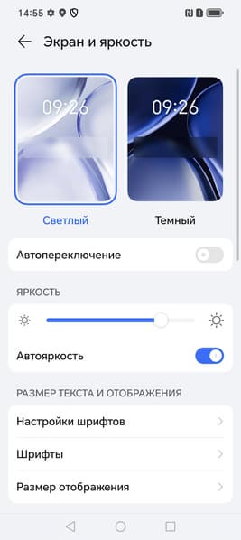 Минимальное значение при ручном управлении яркостью — 2/2 кд/м², то есть пониженный уровень яркости без проблем позволяет использовать устройство даже в полной темноте. Работает автоматическая регулировка яркости по датчикам освещенности (у основного экрана он расположен под экраном близко к верхнему краю правее камеры, а у дополнительного — на фронтальной поверхности у верхнего края слева от решетки громкоговорителя). Работа этой функции зависит от положения ползунка регулировки яркости: им пользователь может попытаться выставить желаемый уровень яркости в текущих условиях. Если оставить все по умолчанию, то в полной темноте функция автояркости уменьшает яркость до 5/4 кд/м² (темновато), в условиях освещенного искусственным светом офиса (примерно 550 лк) устанавливает на 120/114 кд/м² (нормально), а условно под прямыми лучами солнца повышает до 950/1800 кд/м² (отлично). Ради эксперимента в полной темноте мы чуть увеличили яркость и измерили яркость в различных условиях. Установленное значение яркости в темноте сохранилось, в офисе не сильно изменилось, а на ярком свету всегда повышалось до максимума. Получается, что функция автоподстройки яркости работает адекватно и в какой-то степени позволяет пользователю настраивать свою работу под индивидуальные требования.
