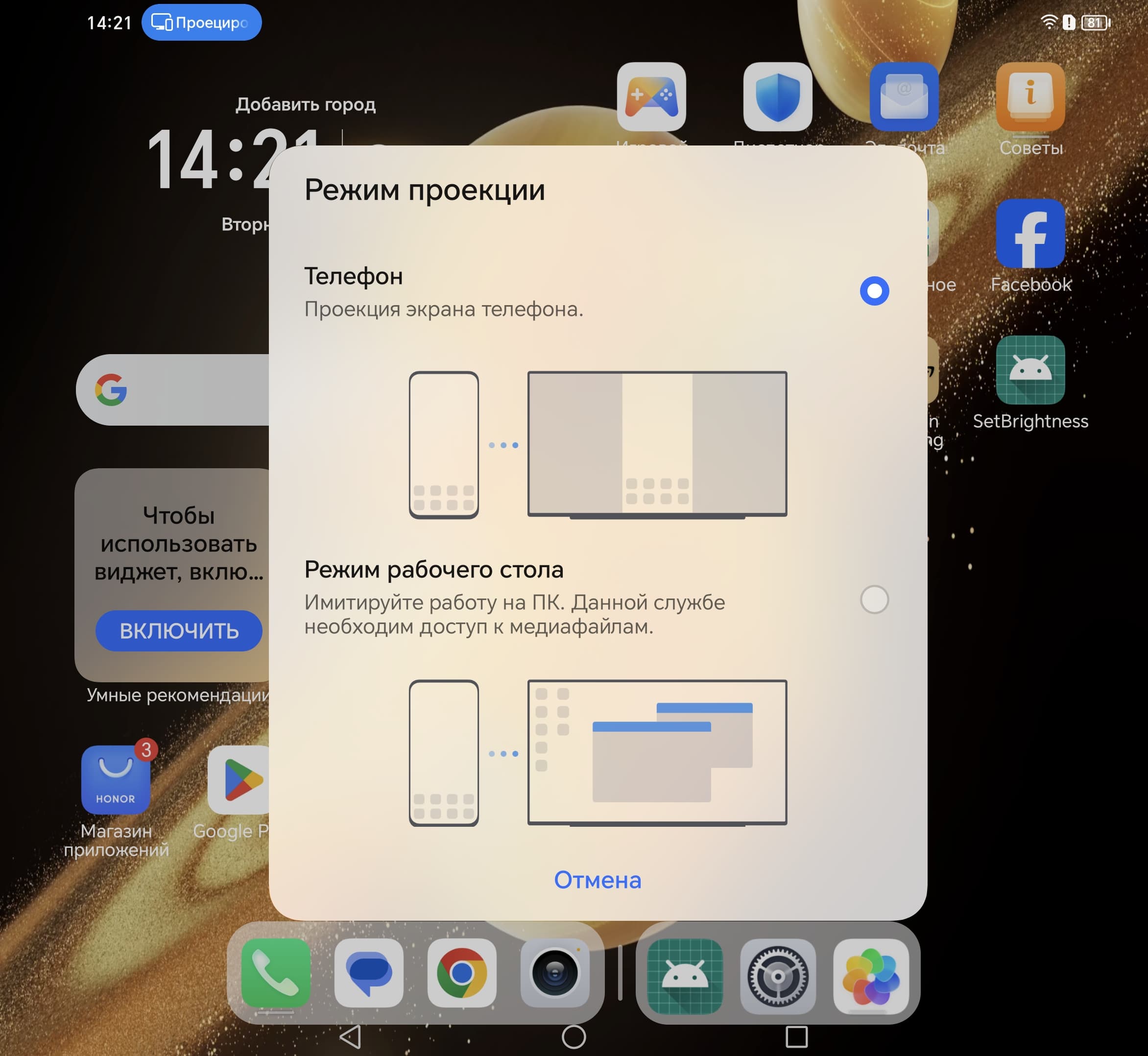 В режиме альтернативного рабочего стола на монитор выводится совершенно другой основной экран, а экран смартфона может использоваться в качестве сенсорной панели координатного ввода: