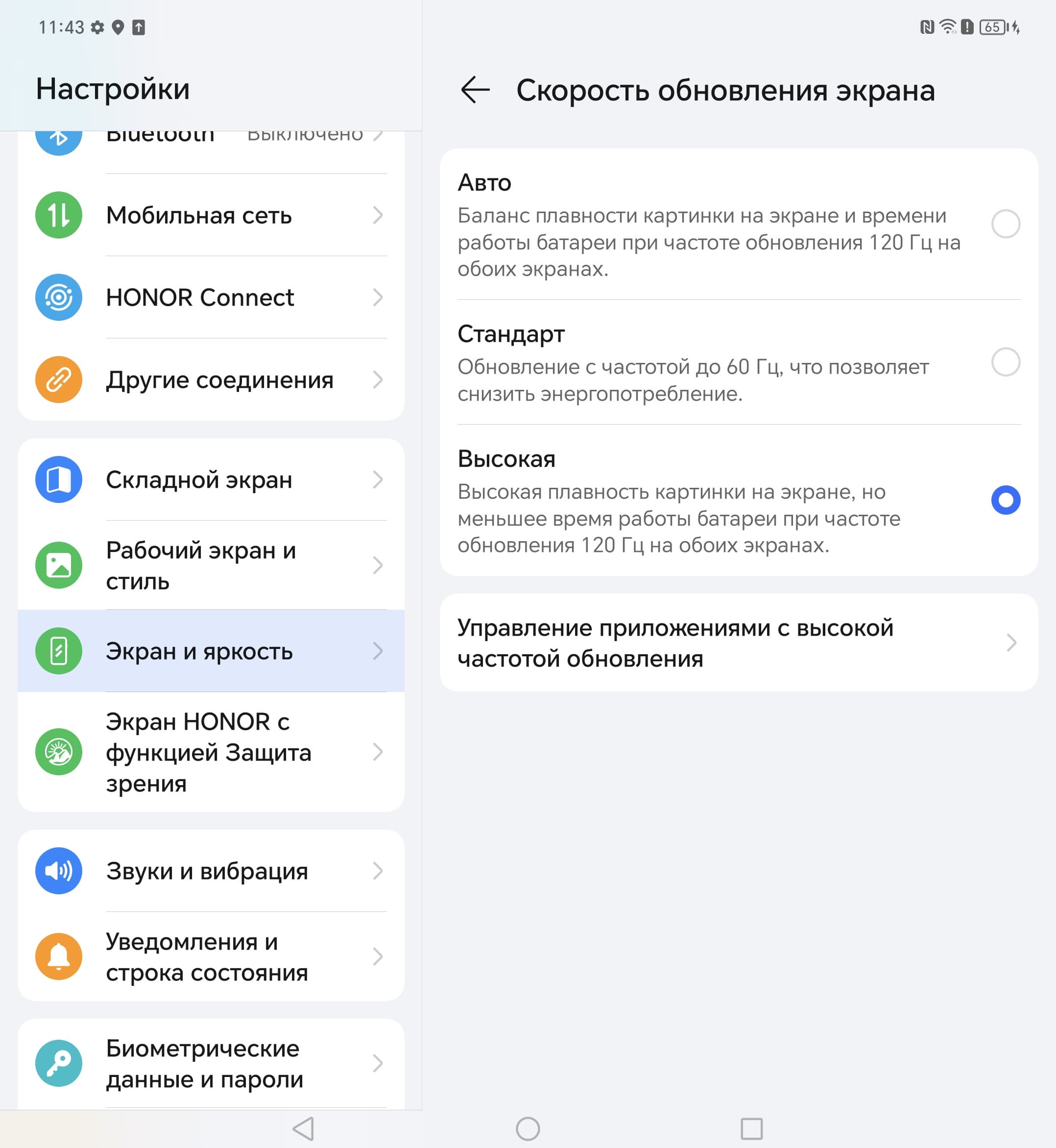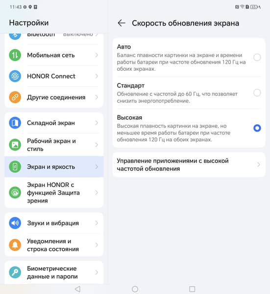В настройках экрана можно включить режим с повышенной до 120 Гц частотой обновления. В этом режиме как минимум увеличивается плавность прокрутки списков в меню.