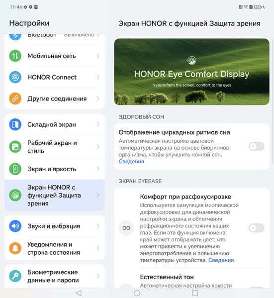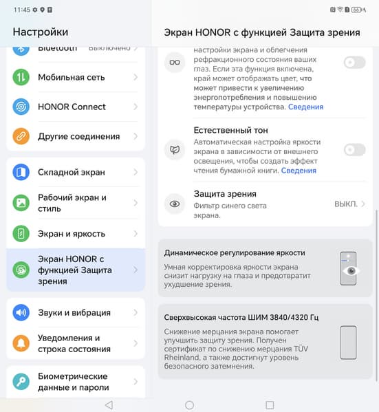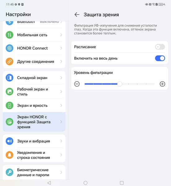 Разумеется, присутствует настройка, позволяющая снизить интенсивность синей компоненты (Защита зрения):