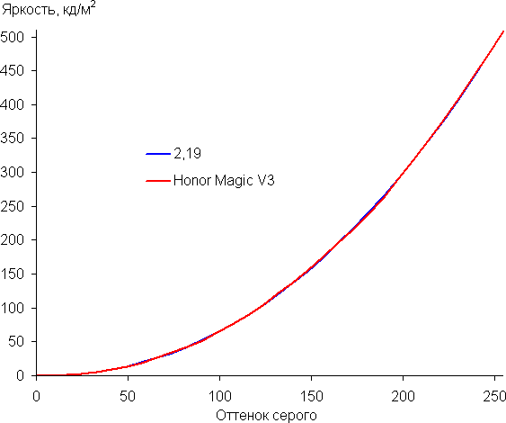 Напомним, что в случае OLED-экранов яркость фрагментов изображения динамично меняется в соответствии с характером выводимого изображения — уменьшается для светлых в целом изображений. В итоге полученная зависимость яркости от оттенка (гамма-кривая), скорее всего, немного не соответствует гамма-кривой статичного изображения, так как измерения проводились при последовательном выводе оттенков серого почти на весь экран.