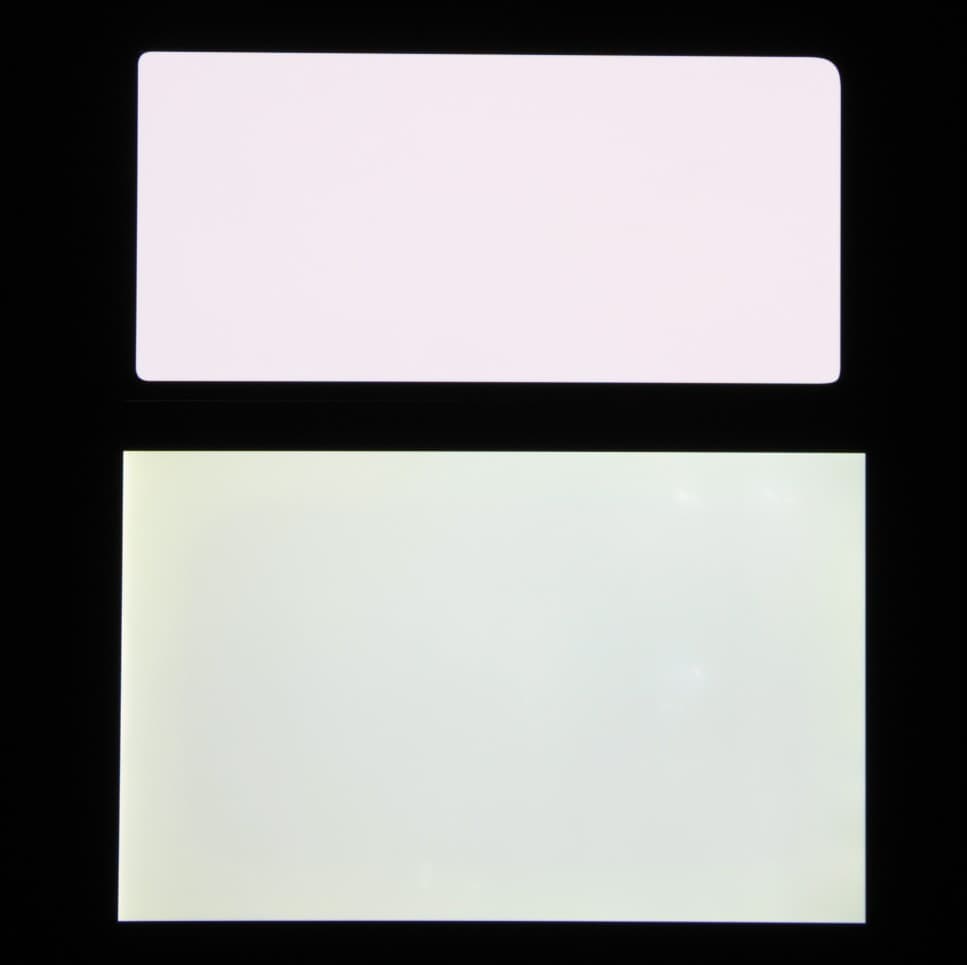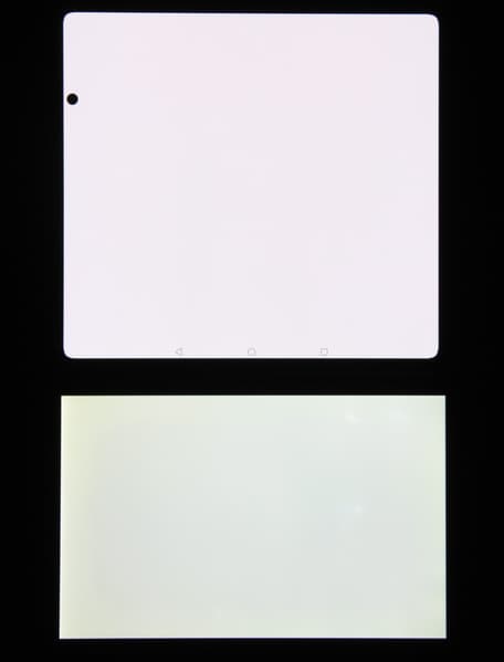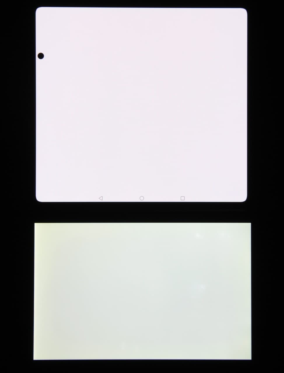 Экраны характеризуются великолепными углами обзора. Правда, белый цвет при отклонении на большие углы в случае основного экрана приобретает легкий сине-зеленый оттенок, а в случае дополнительного значимого изменения оттенка под углами нет. Яркость под углом у всех экранов (если сравнивать еще и с Nexus 7) уменьшается, но в случае смартфона падение яркости выражено гораздо меньше. В итоге, даже если установить формально одинаковую яркость экраны этого смартфона визуально выглядят гораздо более яркими (в сравнении с ЖК-экранами), так как на экран мобильного устройства часто приходится смотреть как минимум под небольшим углом.
