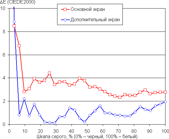 (Самые темные области шкалы серого в большинстве случаев можно не учитывать, так как там баланс цветов не имеет большого значения, да и погрешность измерений цветовых характеристик на низкой яркости большая.)