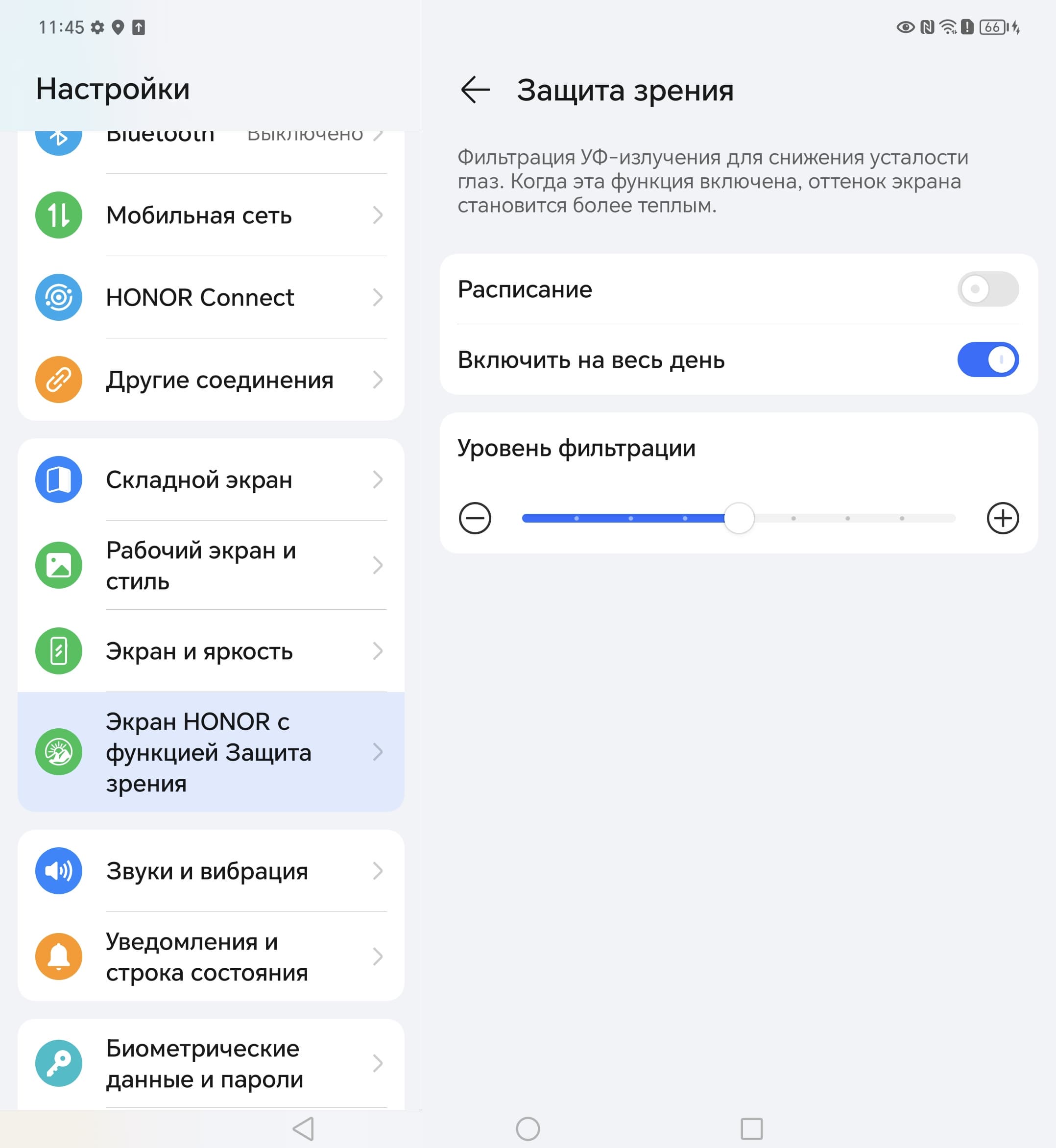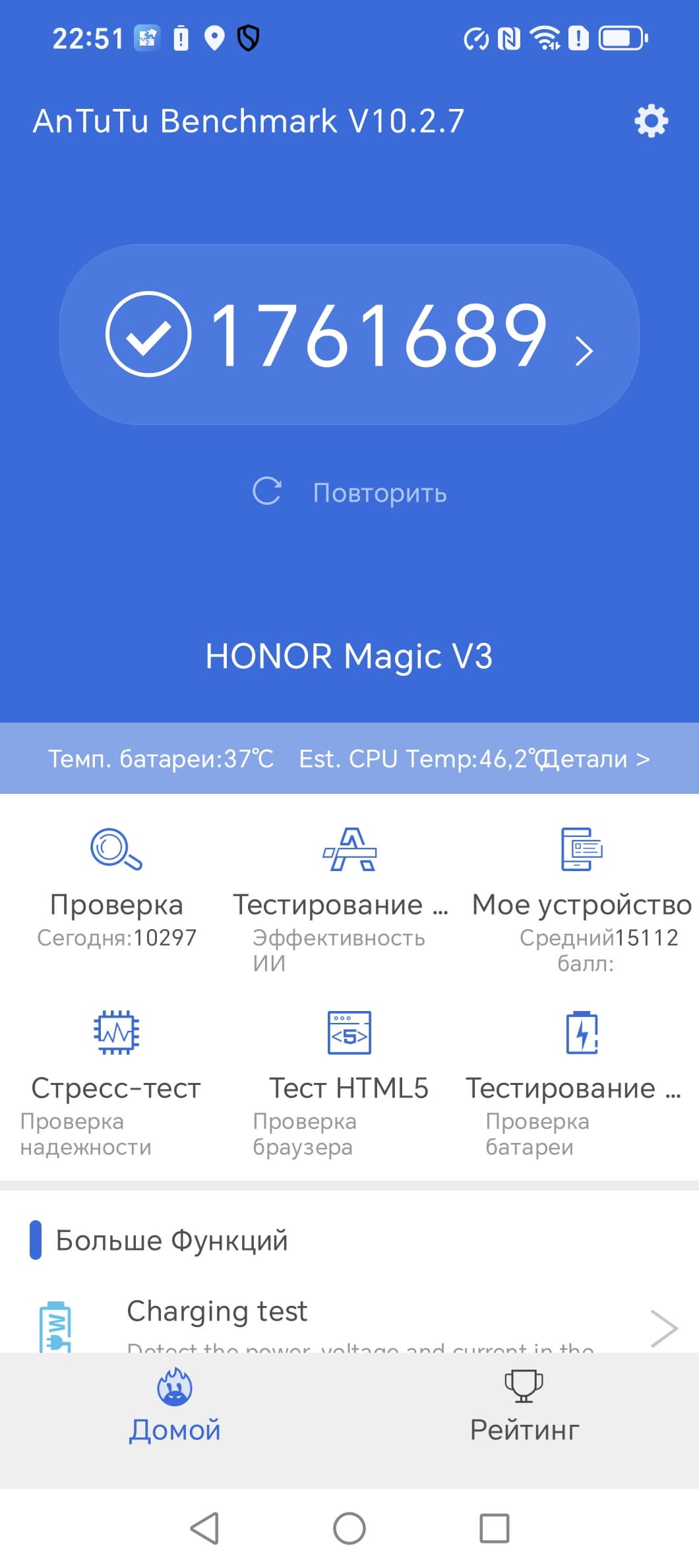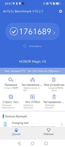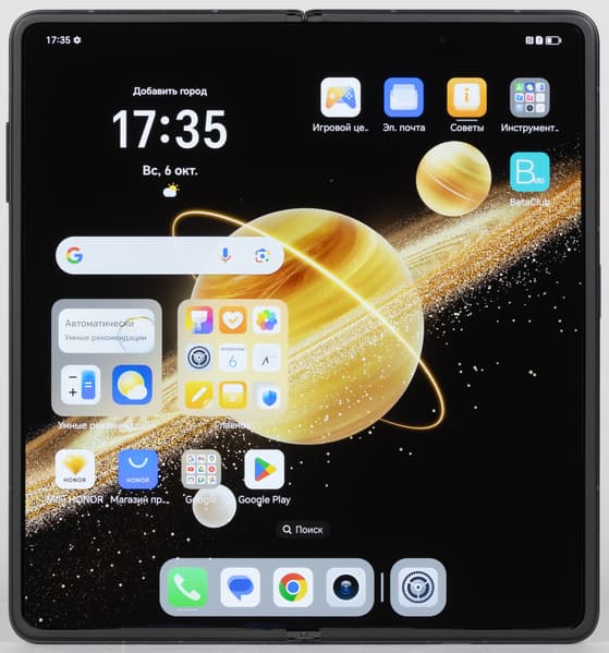 В Honor Magic V3 используется ОС Android 14 с собственной оболочкой MagicOS 8. Интерфейс добротный, хорошо оптимизированный, без навязчивой рекламы, с полным доступом ко всем сервисам Google. Особенностей, отличающих оболочку раскладного смартфона, не так много, и все они завязаны на работу на большом экране. Например, интерфейс управления камерой может работать, разделяясь на две половинки (в одной видеоискатель, а в другой всё управление). Также можно выводить картинку видоискателя на внешний экран, чтобы объект съемки мог видеть себя как в зеркале. В том числе, так можно делать собственные портреты на основную камеру. Применение ИИ нашлось и для фото: приложение «AI Eraser» повторяет Google Magic Editor, позволяя удалять объекты на фото и использовать генеративный ИИ для заполнения фона. «Волшебная капсула» создает информативный блок вокруг селфи-камеры, копируя задумку Dynamic Island.