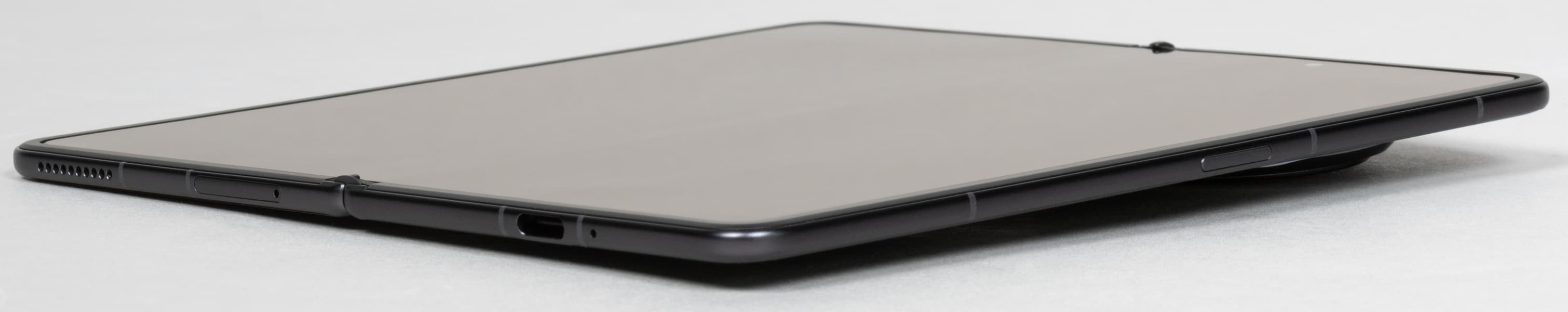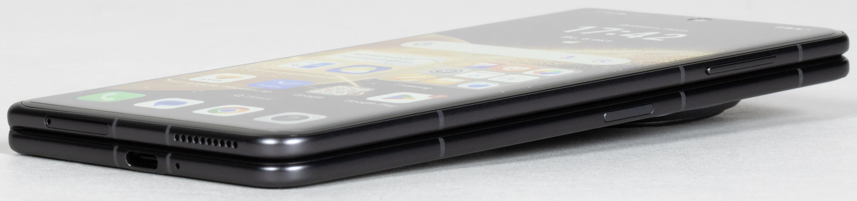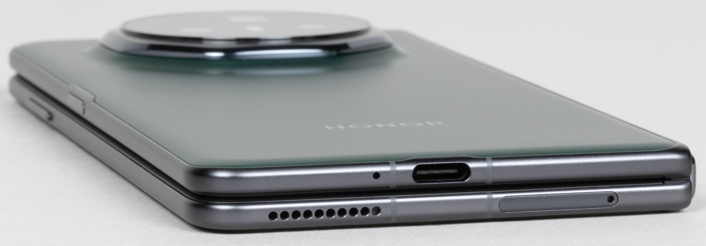 На верхнем и нижнем торцах обеих половинок корпуса суммарно установлены три микрофона, стереодинамики, ИК-порт, разъем USB Type-C и слот для карточек. А вот 3,5-миллиметровый аудиовыход для проводных наушников отсутствует — сюда он, надо полагать, действительно просто не влез бы по толщине.