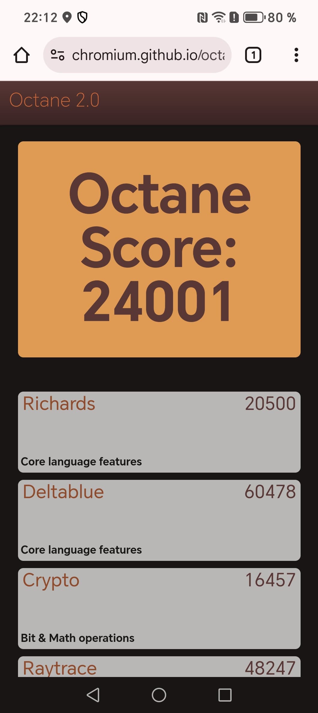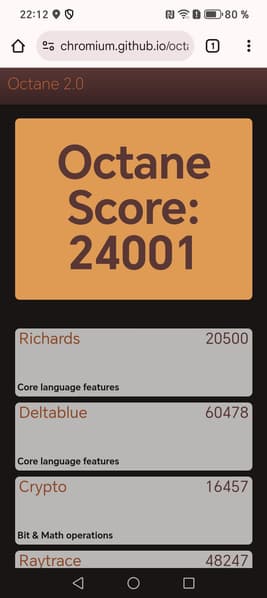 | Google Octane 2 (больше — лучше) | 24001 | 39696 | 21955 | 70812 | 29390 |