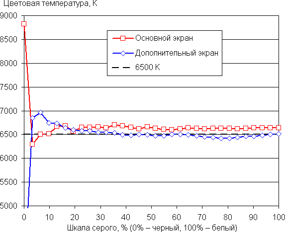 Построенная по 32 точкам с равным интервалом по численному значению оттенка серого гамма-кривая показала, что существенного завала нет ни в светах, ни в тенях. Показатель аппроксимирующей степенной функции равен 2,19 у основного экрана и 2,23 у дополнительного экрана, что близко к стандартному значению 2,2 (потому и картинка имеет естественные светлоту). При этом в обоих случаях реальная гамма-кривая мало отклоняется от степенной зависимости: