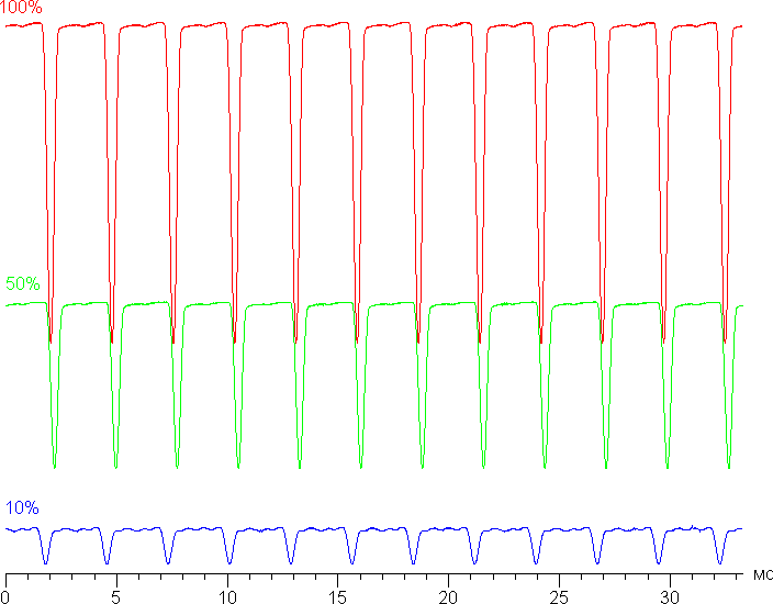 Видно, что скважность модуляции низкая, в итоге видимого мерцания нет на любом уровне яркости. При сильном понижении яркости добавляется модуляция с высокой частотой, но мерцание от этого, естественно, не появляется.