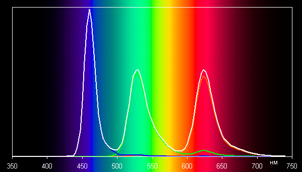 В первом случае спектры компонент (то есть спектры чистых красного, зеленого и синего цветов) очень хорошо разделены (но какое-то подмешивание все же есть):