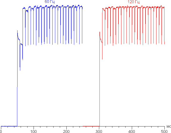 Переключение состояния элементов матрицы выполняется практически мгновенно, но на фронте включения может присутствовать ступенька шириной примерно 17 мс (что соответствует частоте обновления экрана примерно в 60 Гц) или примерно 8 мс (120 Гц). Например, так выглядит зависимость яркости от времени при переходе от черного к белому:
