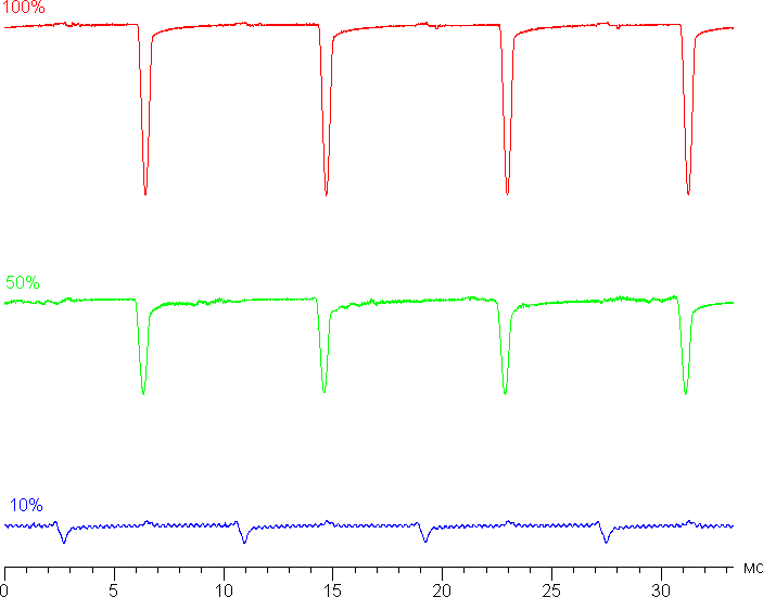 На любом уровне яркости присутствует значимая модуляция с частотой 120 Гц в случае основного экрана и 360 Гц в случае дополнительного. На рисунке ниже приведены зависимости яркости (вертикальная ось) от времени (горизонтальная ось) для нескольких значений настройки яркости: