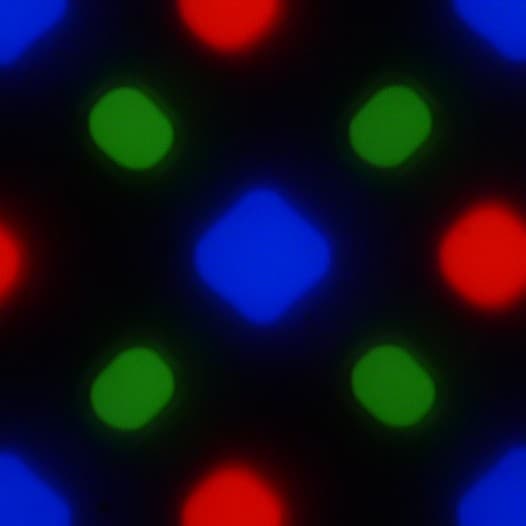 На фрагменте выше можно насчитать 4 зеленых субпикселя, 2 красных (4 половинки) и 2 синих (1 целый и 4 четвертушки), при этом, повторяя эти фрагменты, можно выложить весь экран без разрывов и перехлеста. Для таких матриц компания Samsung ввела наименование PenTile RGBG. Разрешение экрана производитель считает по зеленым субпикселям, по двум другим оно будет ниже. Присутствуют некоторая неровность контрастных границ и другие артефакты, но из-за высокого разрешения они лишь минимально сказываются на качестве изображения.