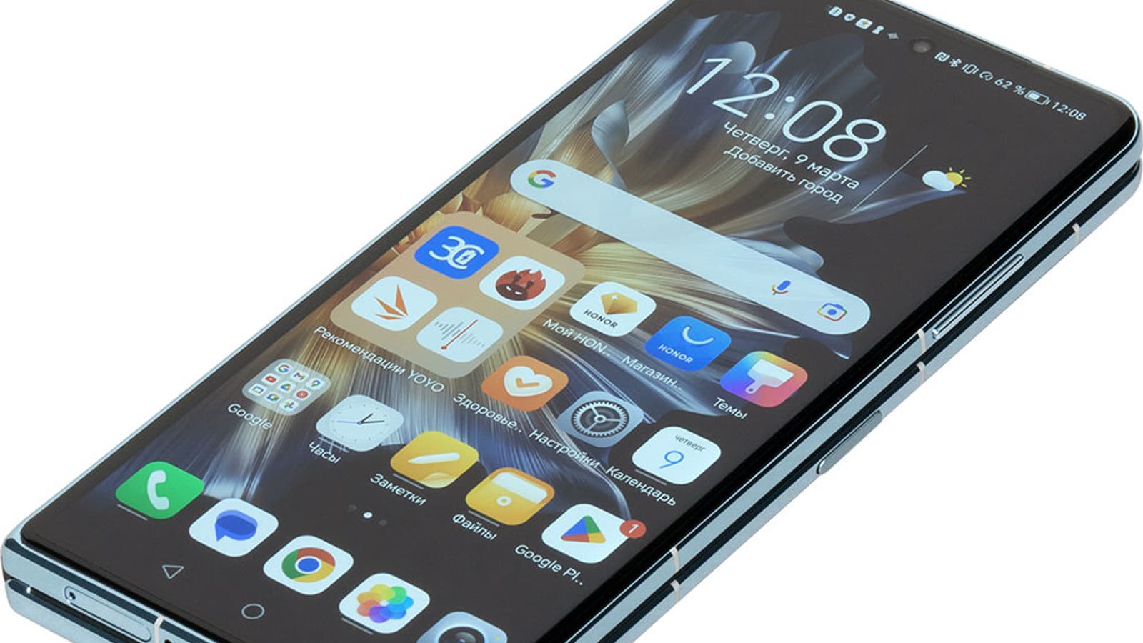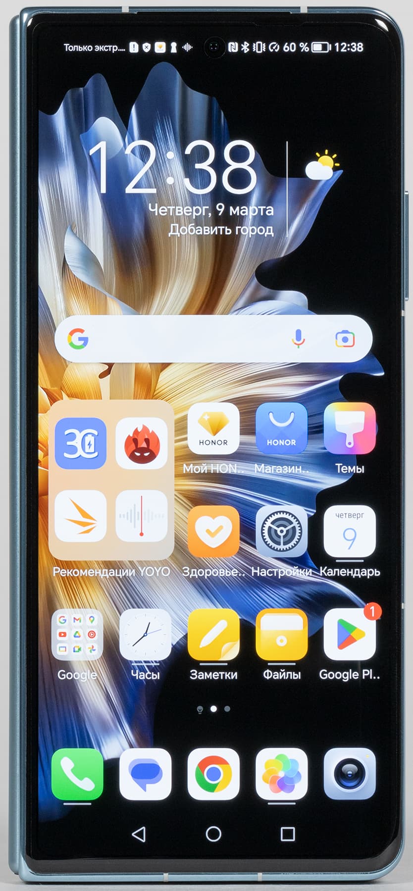 На внешней панели установлен большой экран, занимающий всю ее поверхность. Это высококлассный цветной AMOLED-дисплей с диагональю 6,45″ (2560×1080, 431 ppi), поддерживающий частоту обновления 120 Гц. И это не дополнительный маленький внешний дисплей, предназначенный только для специальных виджетов, а полноценный экран, с которым Honor Magic Vs можно эксплуатировать так же, как любой другой смартфон, вовсе не раскрывая половинки его корпуса.