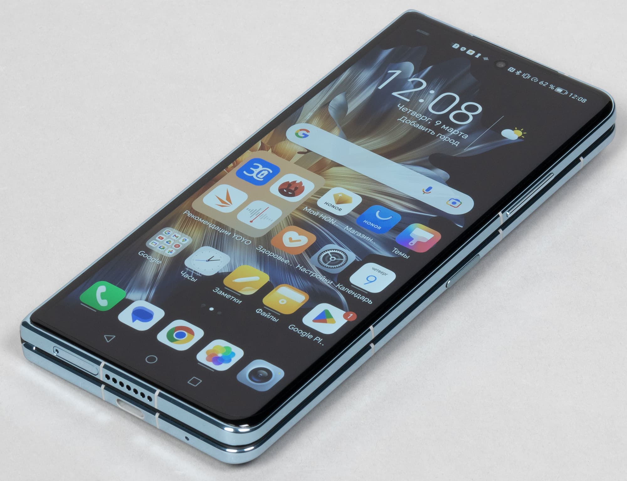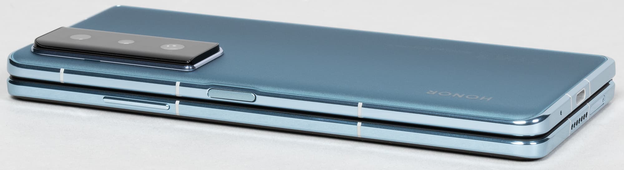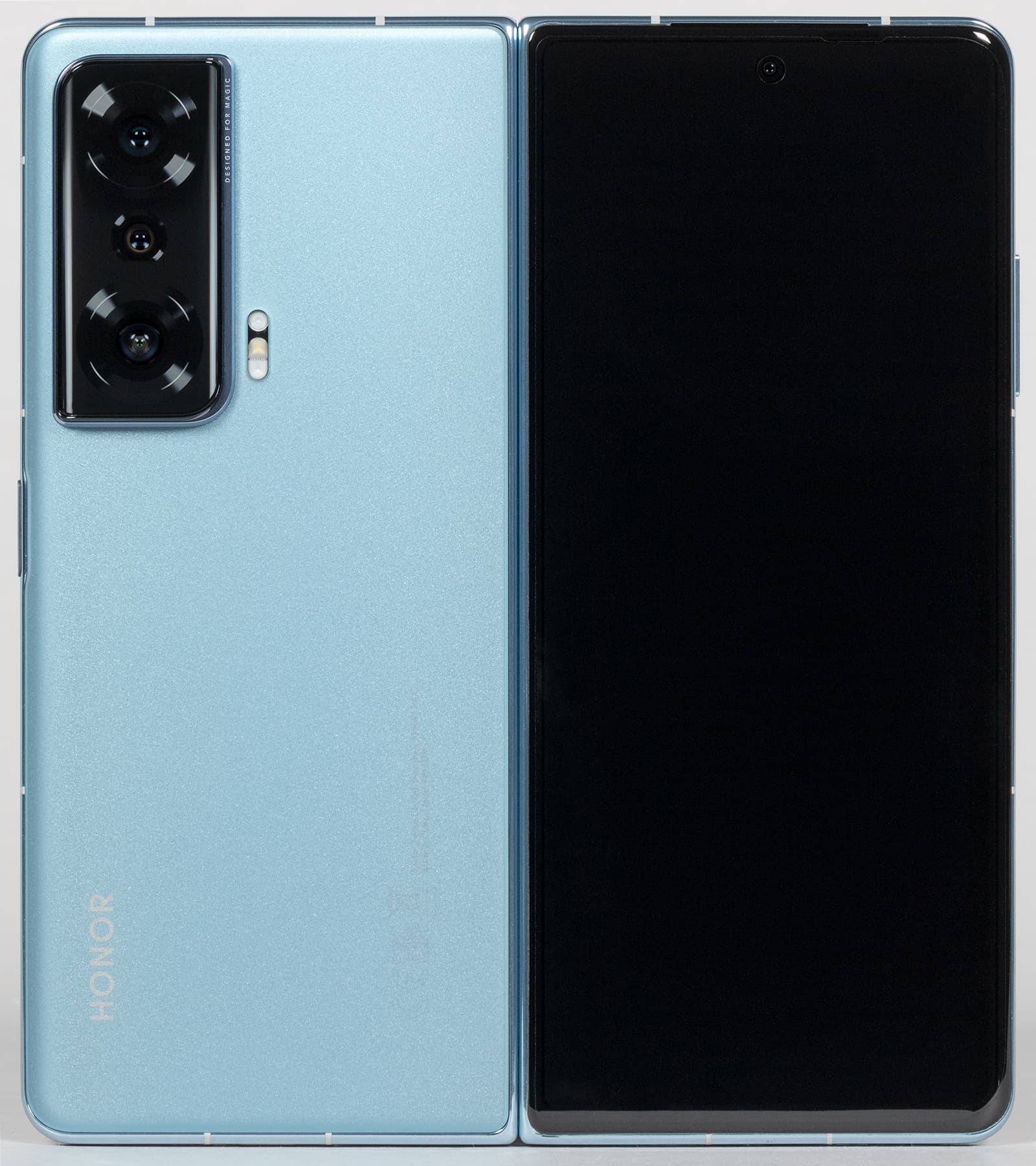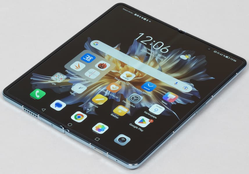 Задумка хорошая — по крайней мере, для тех, кому большой экран мобильного устройства необходим настолько, что он готов мириться с сильно увеличенной массой, обычно превышающей 250 граммов. Да и с большими габаритами устройства в целом. Однако каждый производитель подходит к реализации этого концепта немного по-своему. Honor, например, в отличие от большинства других, почему-то решил не делать фиксацию механизма в открытом положении. То есть здесь нет подпружиненного доводчика и жесткой фиксации экрана в разложенном положении. Половинки просто болтаются на шарнире. Если взять за одну из сторон и потрясти, они будут «играть». Тем более нет четкой фиксации в промежуточных положениях полураскрытого смартфона (например, при раскрытии створок на 90 градусов).