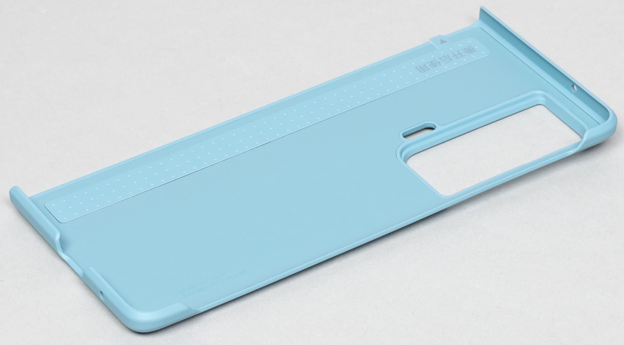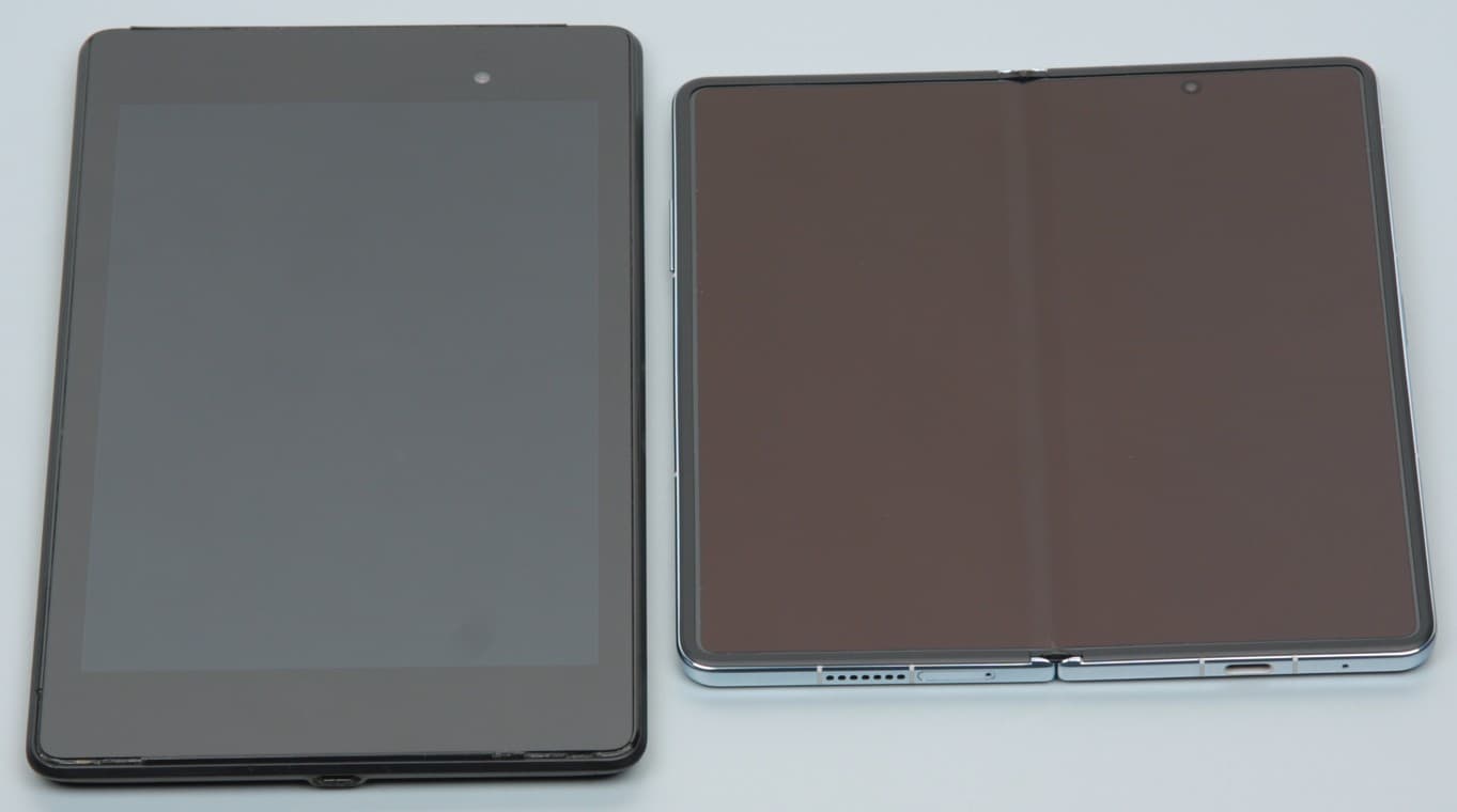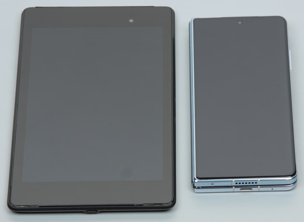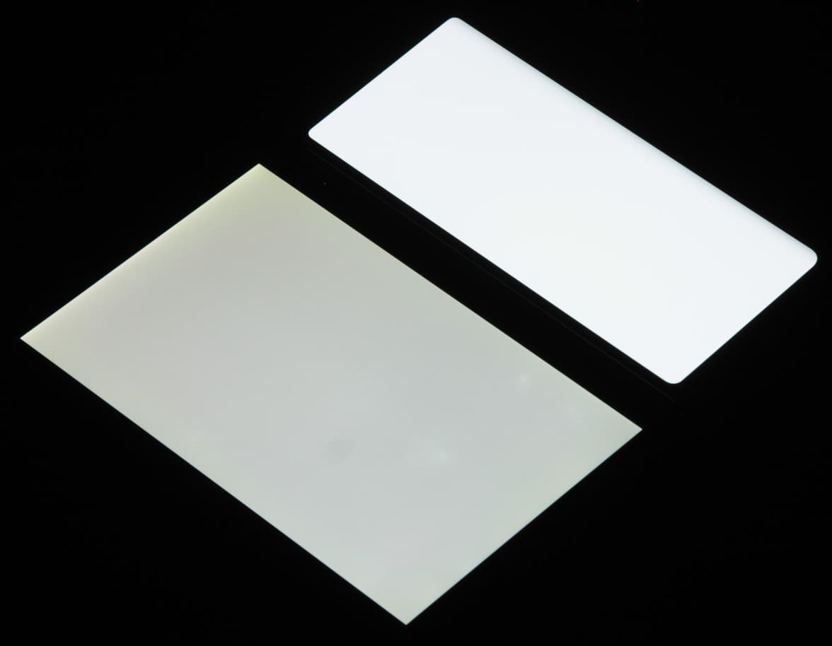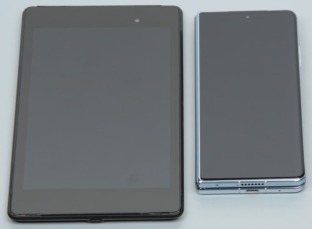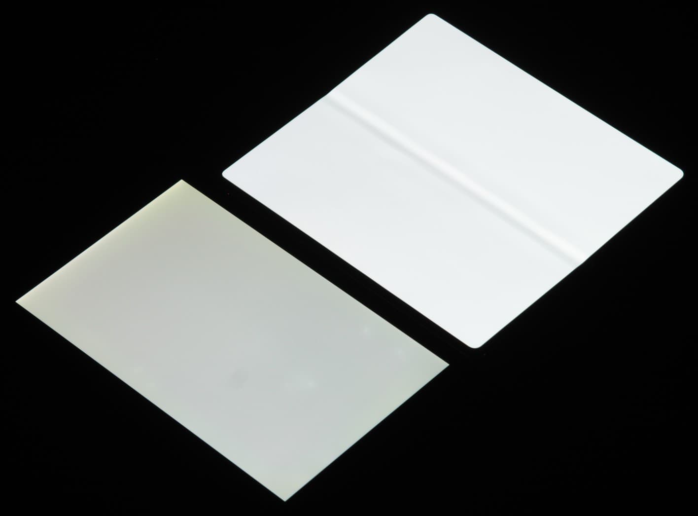 Лицевая поверхность большого раскладывающегося (основного) экрана выполнена из пластика. Дополнительно на экран наклеена защитная пленка, удаление которой запрещено, то есть она является частью экрана. Также эта пленки обладает отличными антибликовыми свойствами. Поверхность пленки относительно устойчива к появлению царапин, по крайней мере, поцарапать ее ногтем не получилось. Поверхность гибкого экрана глянцевая и слегка неровная по всей площади, а в месте сгиба есть выраженная складка. Впрочем, это практически никак не сказывается на изображении, если смотреть на экран более-менее перпендикулярно к его поверхности. Внешняя поверхность дополнительного экрана — это стеклянная пластина с зеркально-гладкой поверхностью, загнутой с одного длинного края и устойчивой к появлению царапин. Изначально на поверхность дополнительного экрана наклеена простая тонкая защитная пластиковая пленка. Судя по отражению объектов, антибликовые свойства основного экрана гораздо лучше, а дополнительного немного лучше, чем у экрана Google Nexus 7 (2013) (далее просто Nexus 7). Для наглядности приведем фотографии, на которой в выключенных экранах отражается белая поверхность (слева — Nexus 7, справа — Honor Magic Vs, далее их можно различать по размеру и форме):