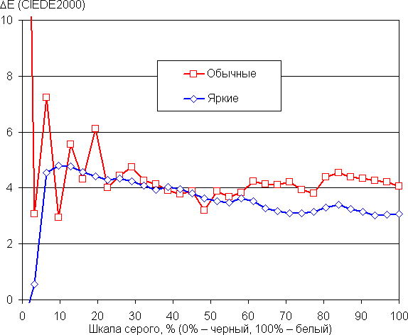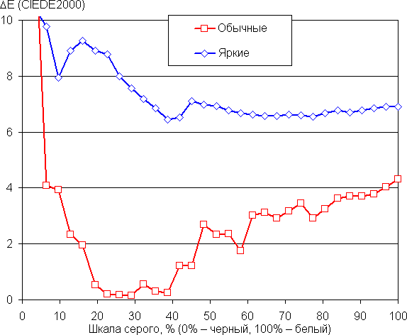 (Самые темные области шкалы серого в большинстве случаев можно не учитывать, так как там баланс цветов не имеет большого значения, да и погрешность измерений цветовых характеристик на низкой яркости большая.)