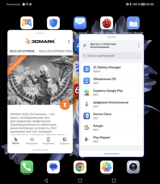 В качестве программной платформы Honor Magic Vs использует версию ОС Android 13 с собственной оболочкой MagicOS 7.1. Были добавлены некоторые новые экосистемные функции и расширены возможности Ассистента Yoyo, но в целом оболочка практически не задействует преимущества раскладывающегося экрана. Просто информации больше влезает, и всё. У большинства «раскладушек» аналогичная ситуация; доработанный под особенности внутреннего экрана софт пока имеется разве что у Samsung. Однако стандартную возможность работы в двух окнах никто не отменял и здесь. На большом экране делать это еще удобнее.