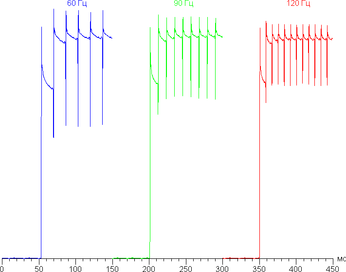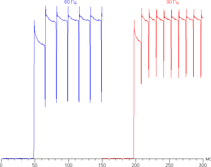Характер модуляции при этом принципиально не меняется, только основная частота модуляции возрастает до 90 Гц, а дополнительная модуляция на низкой яркости — до 2160 Гц.