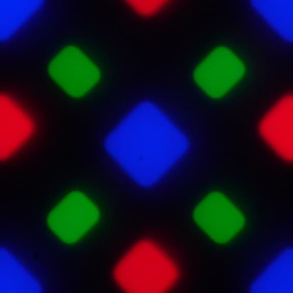 В обоих экранах используется матрица Super AMOLED — активная матрица на органических светодиодах. Полноцветное изображение создается с помощью субпикселей трех цветов — красного (R), зеленого (G) и синего (B), но красных и синих субпикселей в два раза меньше, что можно обозначить как RGBG. Это подтверждается фрагментом микрофотографии: