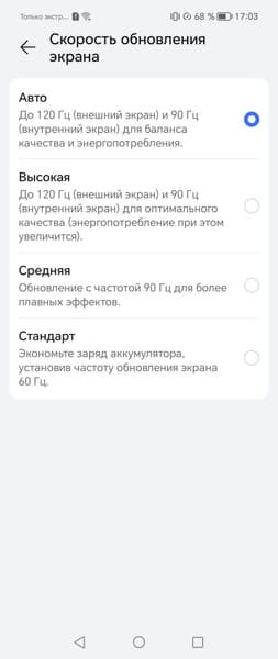 В настройках экрана можно включить режим с повышенной до 90 или 120 Гц (только для дополнительного экрана) частотой обновления. В этом режиме как минимум увеличивается плавность прокрутки списков в меню.