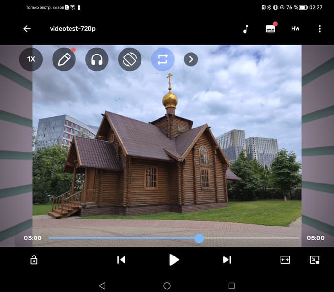 При воспроизведении видеофайлов с соотношением сторон 16:9, например с разрешением 1920 на 1080 (1080p), на основном экране смартфона в ландшафтной ориентации изображение собственно видеофайла выводится по ширине экрана, при этом вертикальную полосу с камерой можно исключить из области вывода видео, что очень правильно. Четкость картинки высокая, но не идеальная, так как от интерполяции к разрешению экрана никуда не деться. Впрочем, можно ради эксперимента переключиться в режим один к одному по пикселям, интерполяции при этом не будет, но картинка немного уменьшится. Интересно, что в этом режиме вертикальная и горизонтальная миры через пиксель выводятся без артефактов.