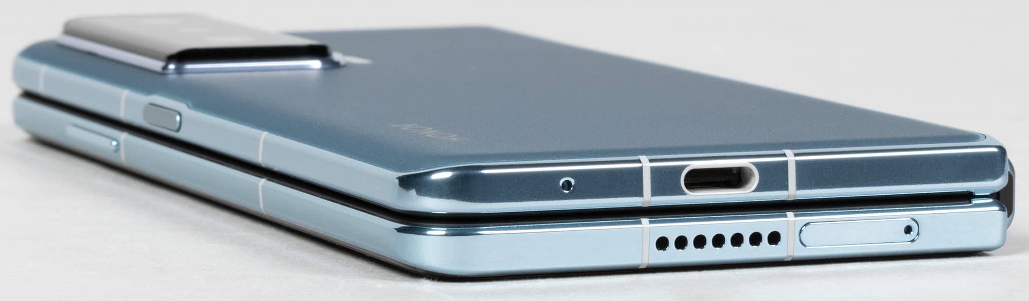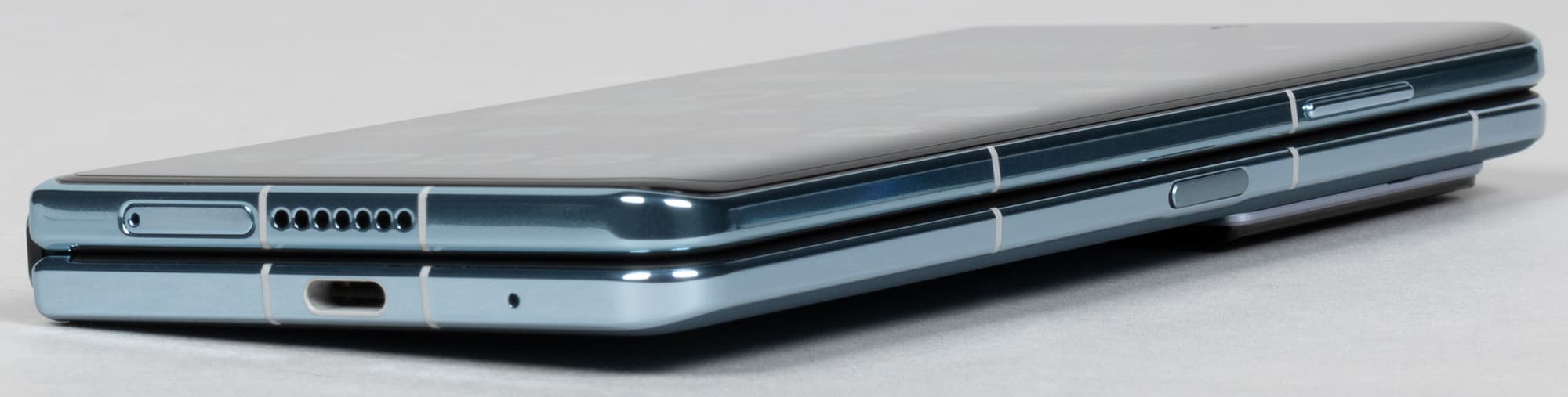 Кнопки грамотно установлены на обоих половинках, так что при раскладывании оказываются не на одной, а на разных сторонах, как и должно быть. Ведь хват «планшета» — двуручный, и кнопки удобно иметь под пальцами с двух сторон, а не с одной. Сканер отпечатков пальцев удачно врезан в боковую клавишу, где ему самое место, особенно в таком тяжелом и толстом устройстве. Разблокировать прикосновением к нижней части экрана такой аппарат было бы совсем некомфортно.