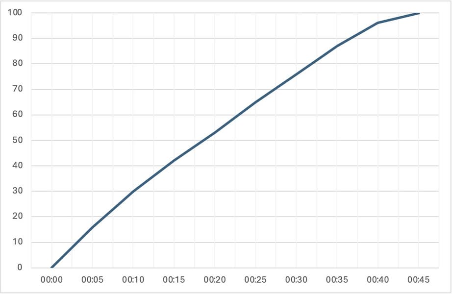 Проверили мы и скорость зарядки. Согласно результатам тестовых замеров, от комплектного зарядного устройства смартфон полностью успевает зарядиться с 0 до 100% за 45 минут.