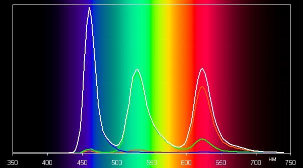 В этом устройстве есть возможность скорректировать цветовой баланс с помощью выбора профиля цветовой температуры или регулировки оттенка на цветовом круге. Впрочем, в случае профиля Обычные даже без коррекции баланс оттенков на шкале серого хороший, так как цветовая температура близка к стандартным 6500 К, а отклонение от спектра абсолютно черного тела (ΔE) ниже 3 единиц, что даже для профессионального устройства считается хорошим показателем. При этом цветовая температура и ΔE мало изменяются от оттенка к оттенку — это положительно сказывается на визуальной оценке цветового баланса. (Самые темные области шкалы серого можно не учитывать, так как там баланс цветов не имеет большого значения, да и погрешность измерений цветовых характеристик на низкой яркости большая.)