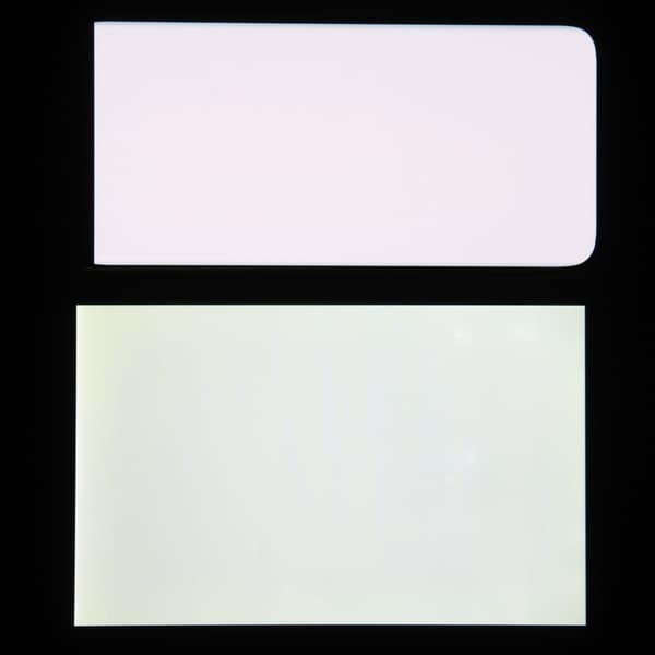 Экран характеризуется великолепными углами обзора. Яркость под углом у обоих экранов заметно уменьшается (если сравнивать с Nexus 7), но в случае смартфона падение яркости выражено гораздо меньше. В итоге при формально одинаковой яркости экран этого смартфона визуально выглядит гораздо более ярким (в сравнении с ЖК-экранами), так как на экран мобильного устройства часто приходится смотреть как минимум под небольшим углом. Правда, у смартфона белый цвет при отклонении на большие углы приобретает легкий синеватый оттенок, но черный цвет остается просто черным под любыми углами. Он настолько черный, что параметр контрастности в данном случае неприменим. Для сравнения приведем фотографии, на которых на экраны смартфона и второго участника сравнения выведены одинаковые изображения, при этом яркость экранов изначально установлена примерно на 200 кд/м², а цветовой баланс на фотоаппарате принудительно переключен на 6500 К.