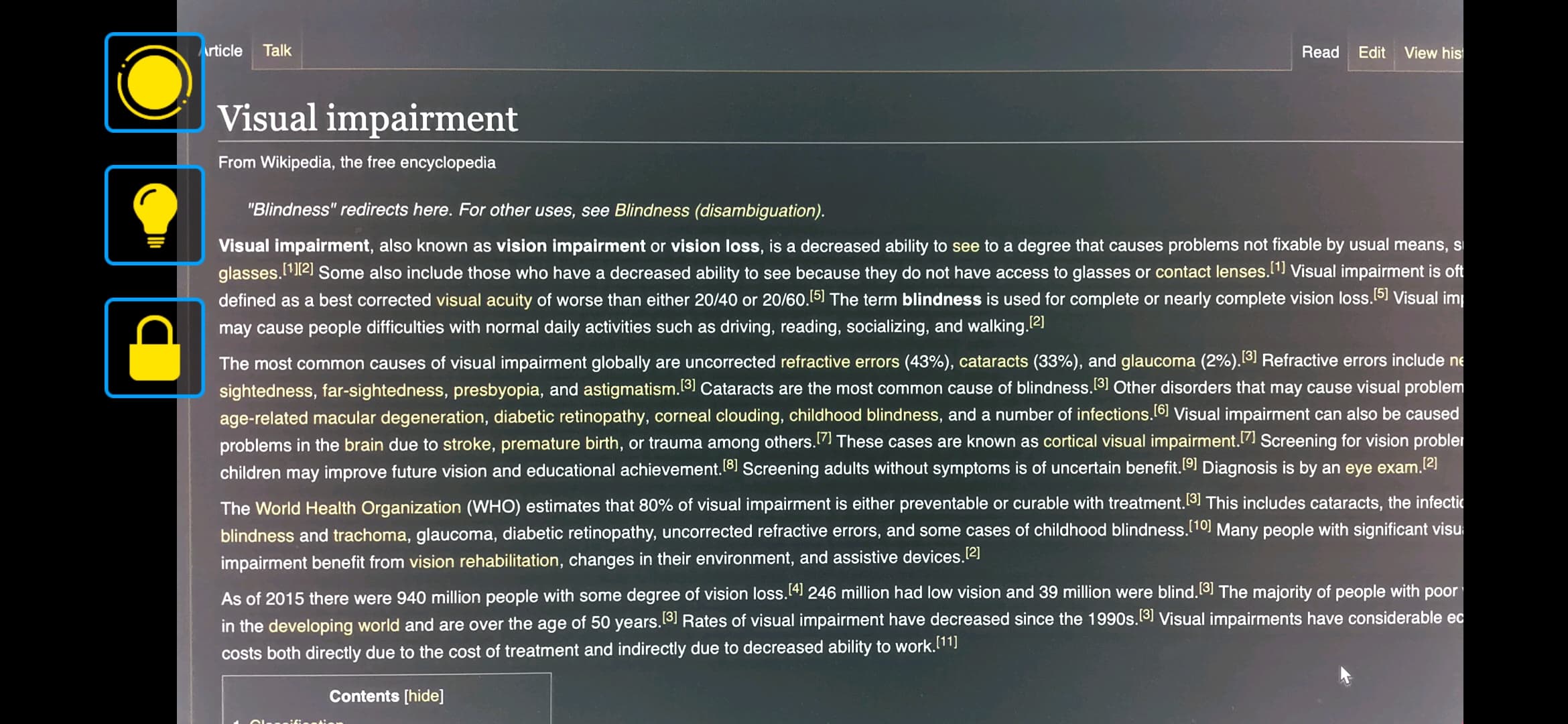 При открытии Vision в левом верхнем углу можно видеть три кнопки. Первая отвечает за изменение контрастности изображения в камере. Это нужно для того, чтобы было проще распознать и прочитать текст. Помимо простого повышения контрастности также доступны чёрно-белый, бело-черный и желто-синий фильтры. С помощью качельки регулировки громкости можно тут же увеличить текст в два или три раза.