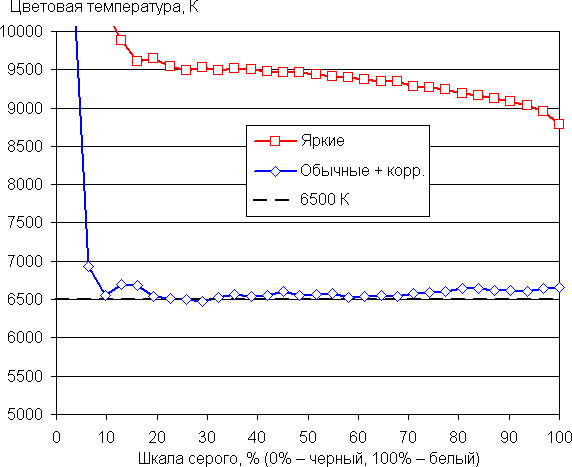 На графиках ниже кривые Яркие соответствуют результатам без какой-либо коррекции цветового баланса (профиль Яркие), а кривые Обычные + корр. — данным, полученным после выбора профиля Обычные и ручной коррекции цветового баланса (точка на круге коррекции — как на снимке выше). (Самые темные области шкалы серого можно не учитывать, так как там баланс цветов не имеет большого значения, да и погрешность измерений цветовых характеристик на низкой яркости большая.)