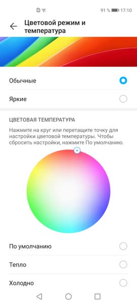 В этом устройстве есть возможность скорректировать цветовой баланс с помощью регулировки оттенка на цветовом круге или просто выбором одного из трех предустановленных профилей.