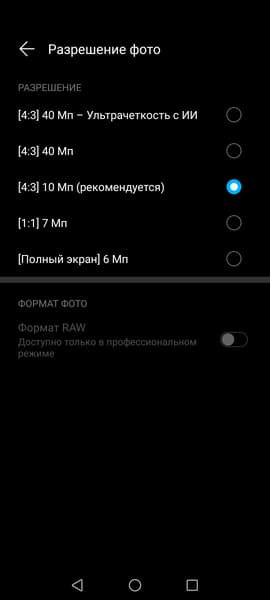 Единственный неудобный момент — реализация переключения между максимальным разрешением и разрешением по умолчанию (10 Мп). Только в режиме съемки 10 Мп появляются все возможности для зумирования, переключения объективов и пр. У смартфонов Xiaomi, например, включение максимального разрешения располагается прямо тут же, на колесе прокрутки, перед глазами — это куда удобнее. У большинства других смартфонов с такой возможностью разрешение тоже переключается на лету, и лишь у Huawei/Honor за этим приходится лезть в настройки.