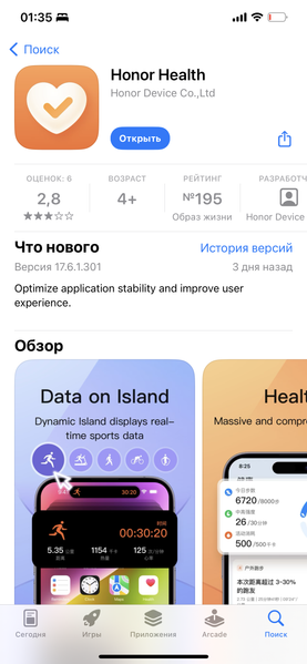 Для работы с часами надо установить приложение Honor Здоровье и связать его с часами. После первой настройки вам, скорее всего, будет предложено обновить ПО, и это, конечно, стоит сделать, но надо быть готовым к тому, что процесс займет немало времени.