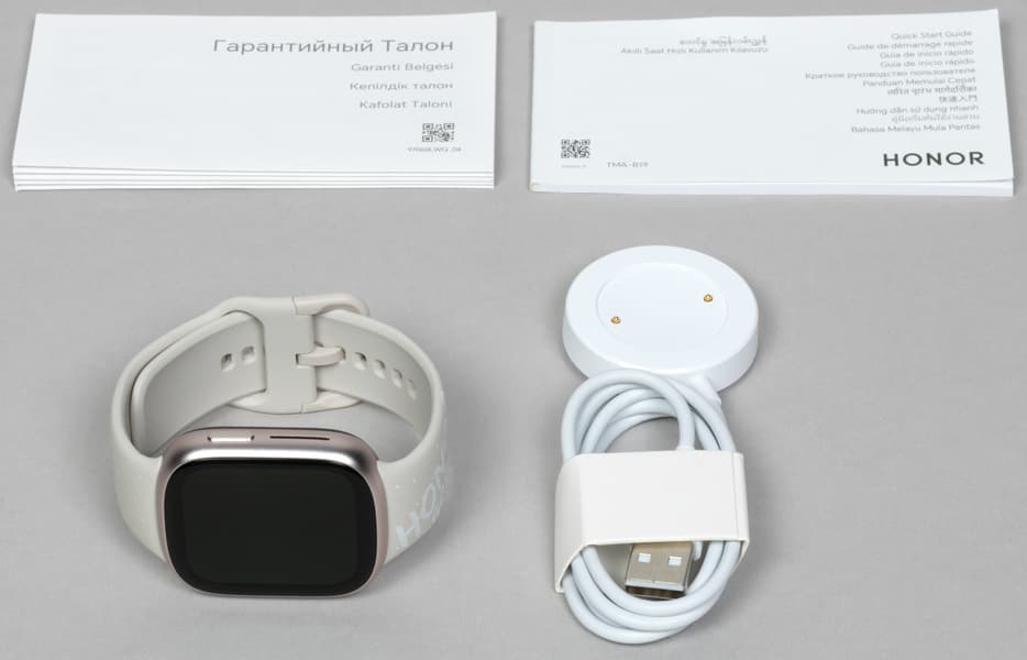 Комплектация включает два крошечных буклета: «Краткое руководство пользователя» (увы, практически бесполезное, несмотря на русскоязычный блок: там только информация о предосторожностях и прочие формальности) и «Гарантийный талон», а также зарядный кабель со штекером USB-A на одном конце и платформой с двумя контактами на другом.