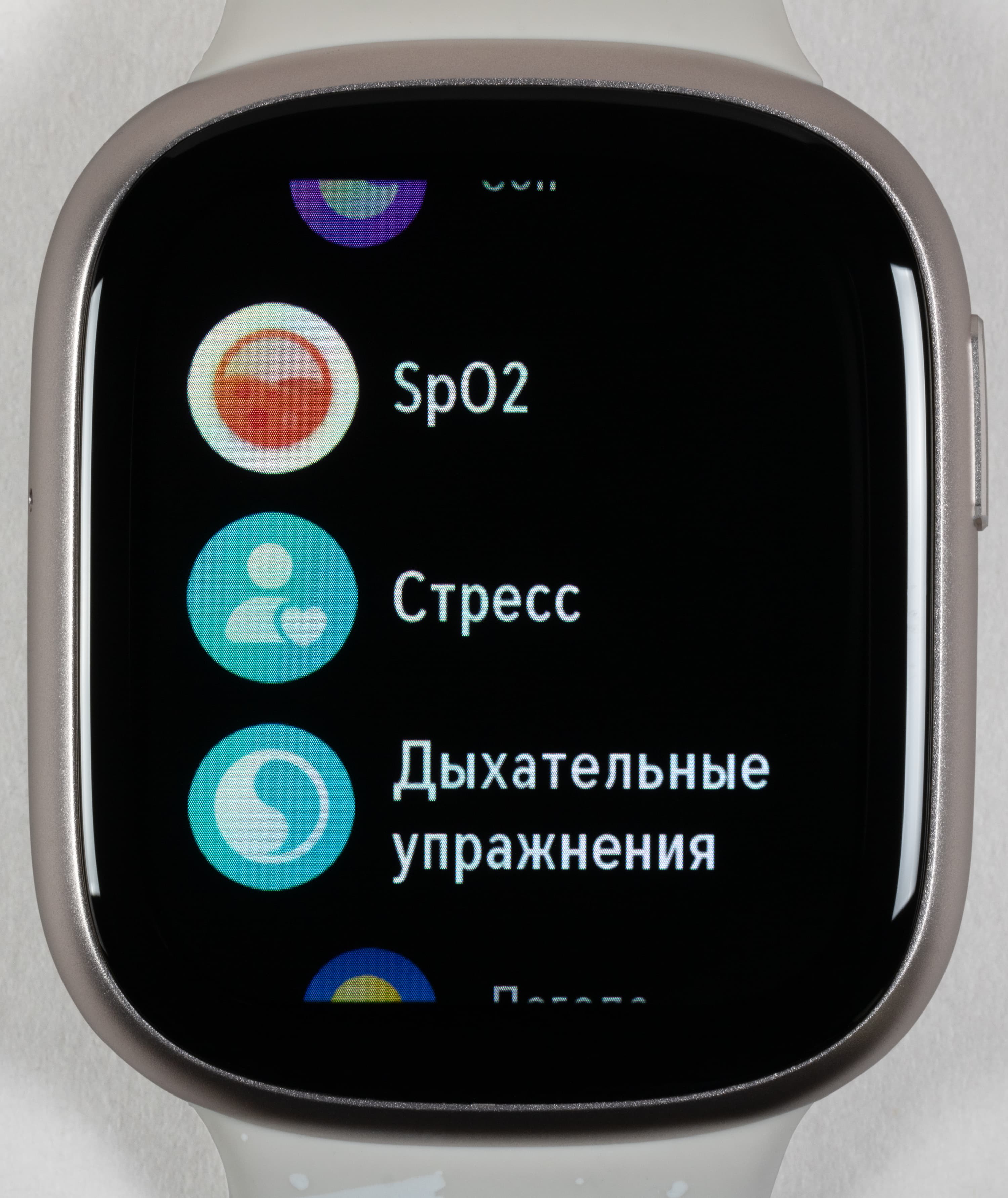 Меню приложений решено в виде вертикального списка. В нем опять же почти никаких сюрпризов нет, за одним исключением (о нем ниже). Итак, пользователю доступны: «Тренировки» (выбор очень большой, в том числе водные виды спорта, но почему-то нет лыж, хотя есть кэндо, брусья, танцы живота, дартс и прочая экзотика), «Телефон» (набор номера для телефонного звонка через Bluetooth смартфона), «Музыка» (воспроизведение музыкой, загруженной с Android-смартфона на часы; для пользователей iOS, увы, опция бесполезна), «Пульс», «Сон», SpO2 (измерение уровня кислорода в крови), «Стресс» (определение уровня стресса на основе различных параметров), «Дыхательные упражнения», «Погода», «Будильник», «Секундомер», «Таймер», «Компас», «Фонарик» (экран часов включается на максимальную яркость и отображает белое поле), «Поиск устройства» (то есть смартфона).