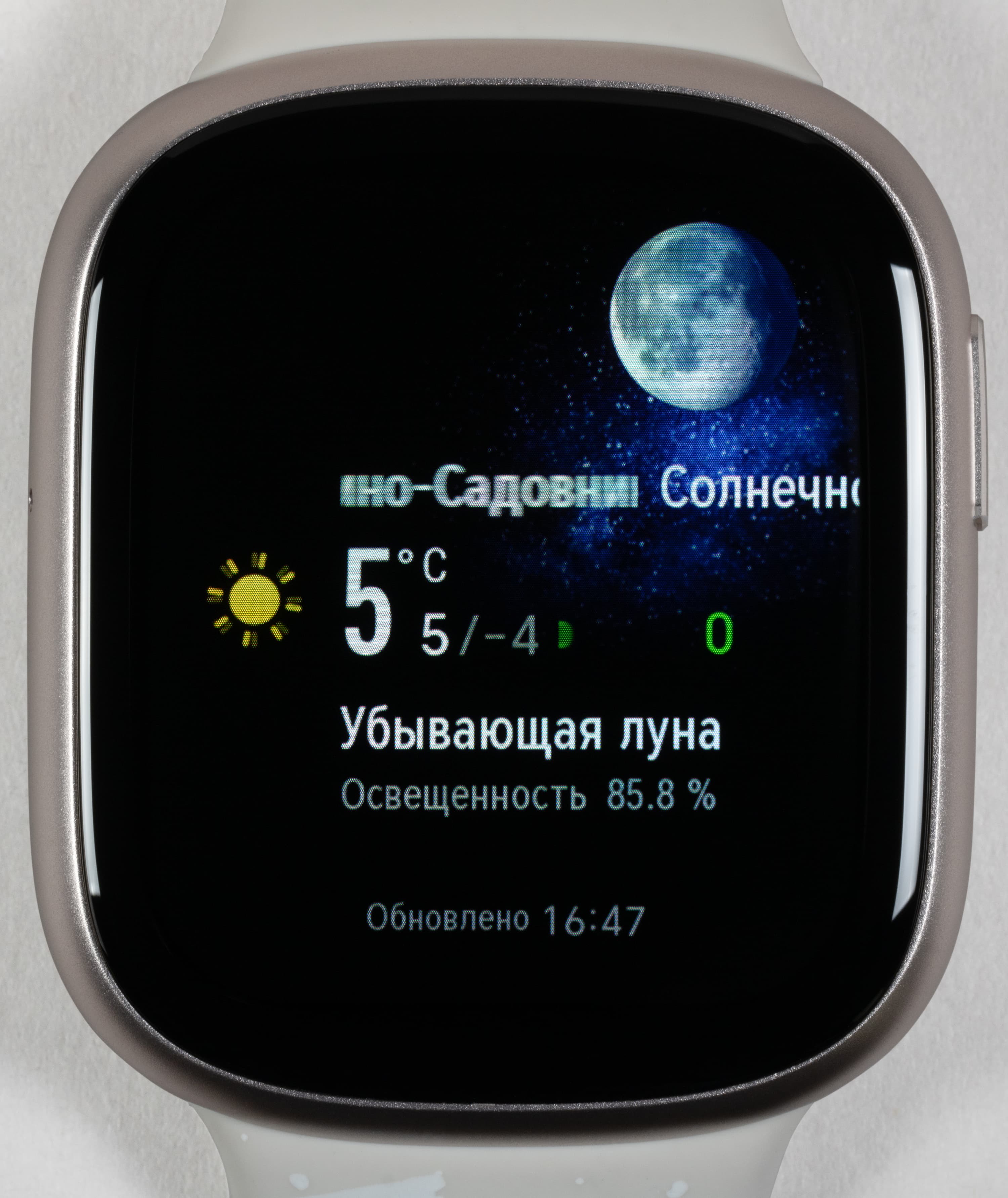 Лицевая поверхность экрана выполнена в виде стеклянной пластины с зеркально-гладкой поверхностью, устойчивой к появлению царапин. Судя по отражению объектов, антибликовые свойства немного лучше, чем у экрана Google Nexus 7 (2013) (далее просто Nexus 7). Двоение отражения слабое, это свидетельствует о том, что между слоями экрана нет воздушного промежутка. Внешняя поверхность экрана часов обладает выраженными олеофобными (жироотталкивающими) свойствами (которые заметно лучше, чем у Nexus 7), поэтому следы от пальцев удаляются существенно легче, а появляются с меньшей скоростью, чем в случае обычного стекла. Вывести произвольное изображение на экран часов можно только в виде фона циферблата, но и это позволило провести ряд тестов. При выводе белого поля и при ручной регулировке максимальное зарегистрированное нами значение яркости составило порядка 580 кд/м² (в режиме фонарика — 970 кд/м²). С учетом отличных антибликовых свойств это позволит разглядеть изображение на экране часов в условиях сильной засветки (ясный день на улице). Минимальное значение — 18 кд/м², то есть в полной темноте яркость получится снизить до комфортного уровня. Есть и режим с автоматической регулировкой яркости по датчику освещенности. Если оставить все по умолчанию, то в полной темноте функция автояркости уменьшает яркость до 10 кд/м² (нормально), в условиях освещенного искусственным светом офиса (примерно 550 лк) устанавливает на 110 кд/м² (что и нужно), а условно под прямыми лучами солнца повышает до 550 кд/м² (что немного ниже, чем при ручной регулировке). Получается, что функция автоподстройки яркости работает адекватно.