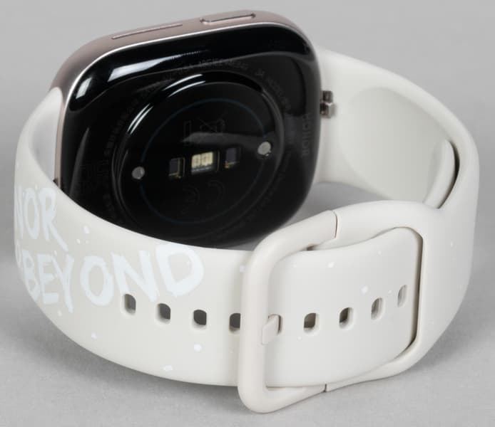 В остальном же — алюминиевый корпус с сильно скругленными углами и гранями, внешне идентичное Apple Watch крепление ремешка к корпусу (на самом деле нет), черная тыльная поверхность, продолговатая кнопка сбоку, даже сам ремешок — ну, кажется, дизайнеры устройства не скрывали источник вдохновения.