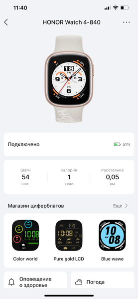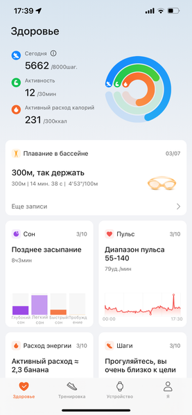 Впрочем, отчасти это компенсируется интуитивностью самого приложения. В нем четыре раздела — «Здоровье», «Тренировка», «Устройство» и «Я». И, в общем-то, даже не требуется рассказывать, что в них можно найти. Заметим лишь, что набор виджетов в «Здоровье» можно менять, но поскольку приложение единое для всех носимых устройств линейки, далеко не факт, что выбранный вами виджет будет поддерживаться Honor Watch 4 и сможет получать информацию от часов.