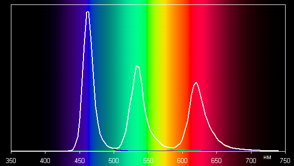 Спектры типичны для OLED — области первичных цветов хорошо разделены и имеют вид относительно узких пиков, перекрестное подмешивание цветов практически отсутствует: