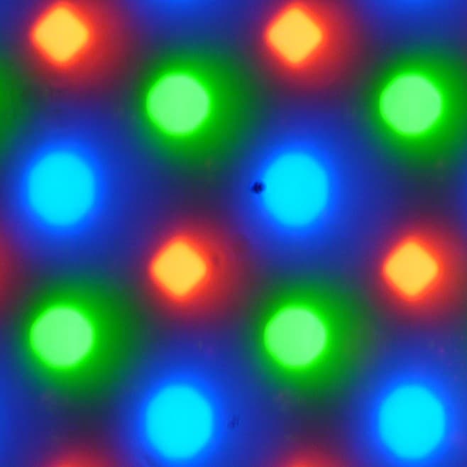 В этом экране используется OLED-матрица — активная матрица на органических светодиодах. Полноцветное изображение создается с помощью субпикселей трех цветов — красного (R), зеленого (G) и синего (B) в равном количестве, что подтверждается фрагментом микрофотографии: