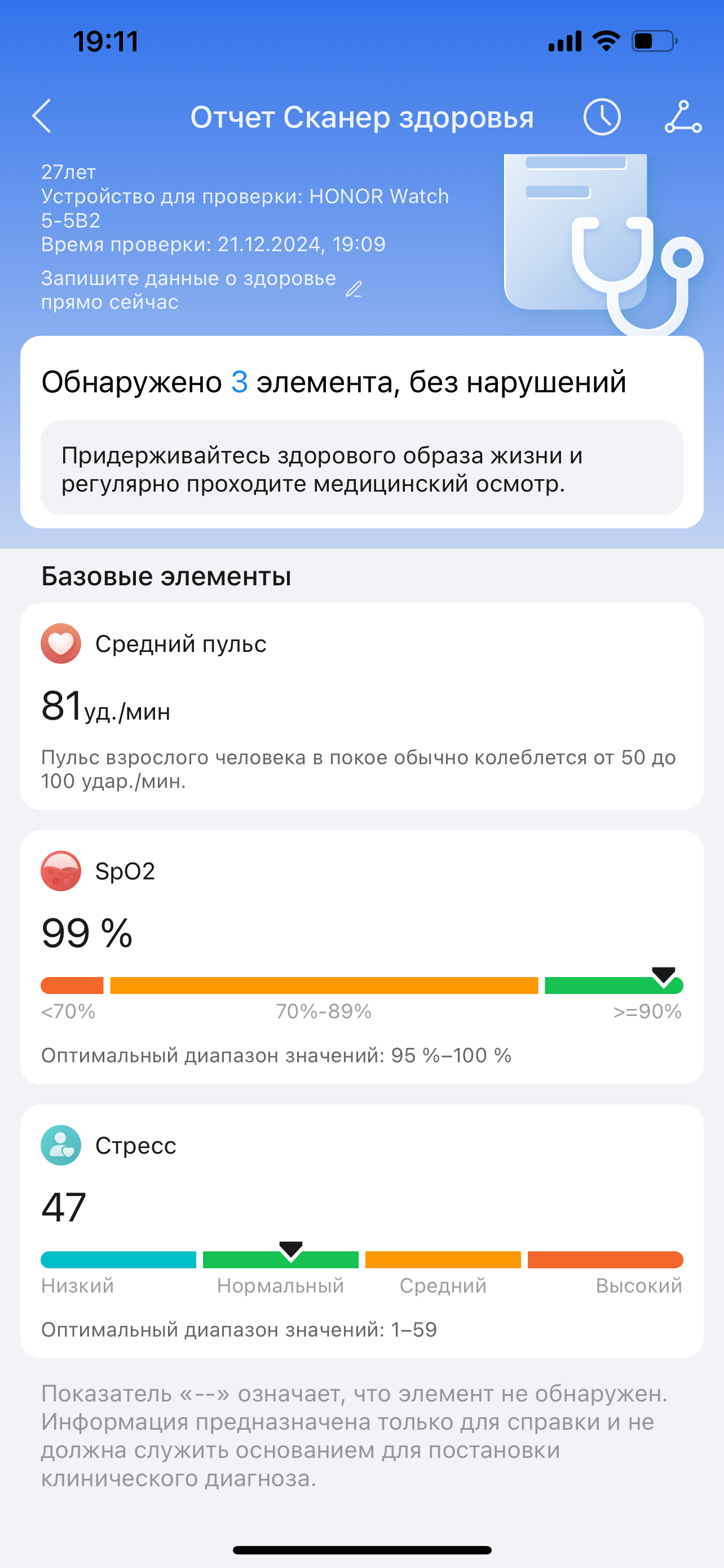В Honor Watch 5 появилось комплексное измерение показателей здоровья. За 45 секунд часы проверяют уровень кислорода в крови (SpO2), частоту пульса и уровень стресса, предоставляя результат в удобной форме на одном экране. Дополнительно устройство предоставляет утренние отчеты, где отображаются данные о качестве сна, частоте пульса в состоянии покоя и уровне стресса.