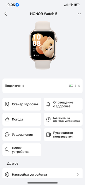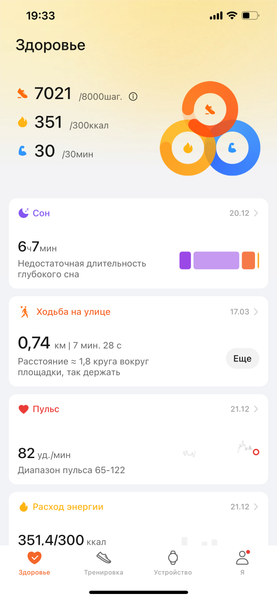 Для работы с часами надо установить приложение Honor Здоровье и связать его с часами. И сам этот процесс, и интерфейс приложения нам хорошо известны по прошлым моделям часов Honor, так что не будем подробно это описывать. Просто напомним, что здесь четыре раздела — «Здоровье», «Тренировка», «Устройство» и «Я». Из них в повседневной жизни нужно первое и, с натяжкой, третье.