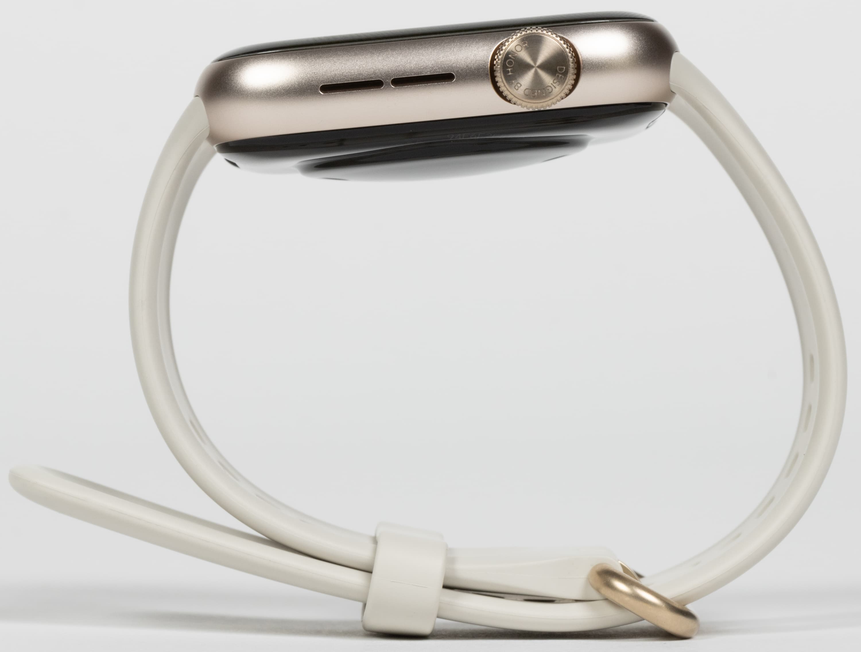 Корпус выполнен из алюминия, имеет сильно скругленные углы и грани, эффектную выпуклость стекла (2.5D) и внешне идентичное Apple Watch крепление ремешка к корпусу (самом деле — не совсем, но об этом — чуть позже).